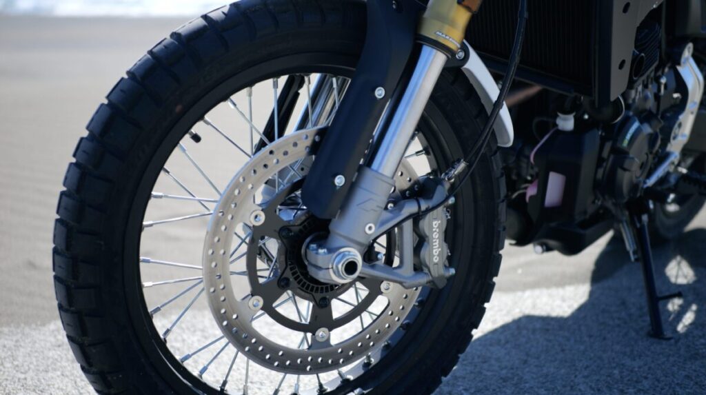 キャバレロ スクランブラー700に乗って最初に感じたのは、エンジンとシャシーのバランスが非常に良いこと。僅か175kg(ガソリン抜き)という軽量かつコンパクトな車体にヤマハのCP2エンジンを搭載することによって、パワーがあるのにピーキー過ぎることもなく、野生的な鼓動感や瞬発的なパワフルさも感じることのできるのだ。もちろんCP2エンジンはそのまま搭載しているのではなく、キャバレロ スクランブラー700用にきちんと調整されていて、同モデルエンジンを搭載するテネレ700のような低速のトルク感を残しつつ、MT-07のようにトップギアをワイドにすることによって、どんなシーンでもギアに迷ってしまうことがない。