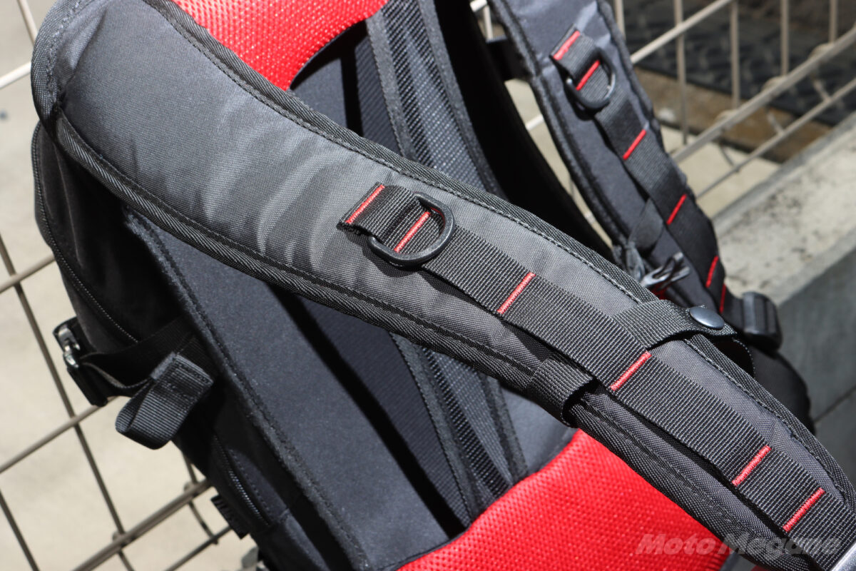 ショルダーストラップは絶妙なアールを描く形状で腕の動かしやすさも良好。幅が広めでライディング時にズレることも無かった。