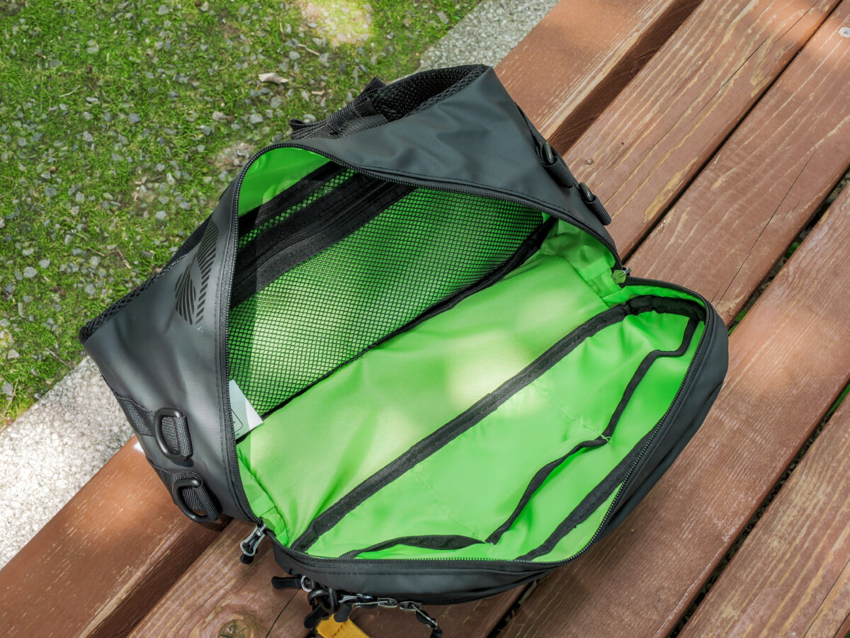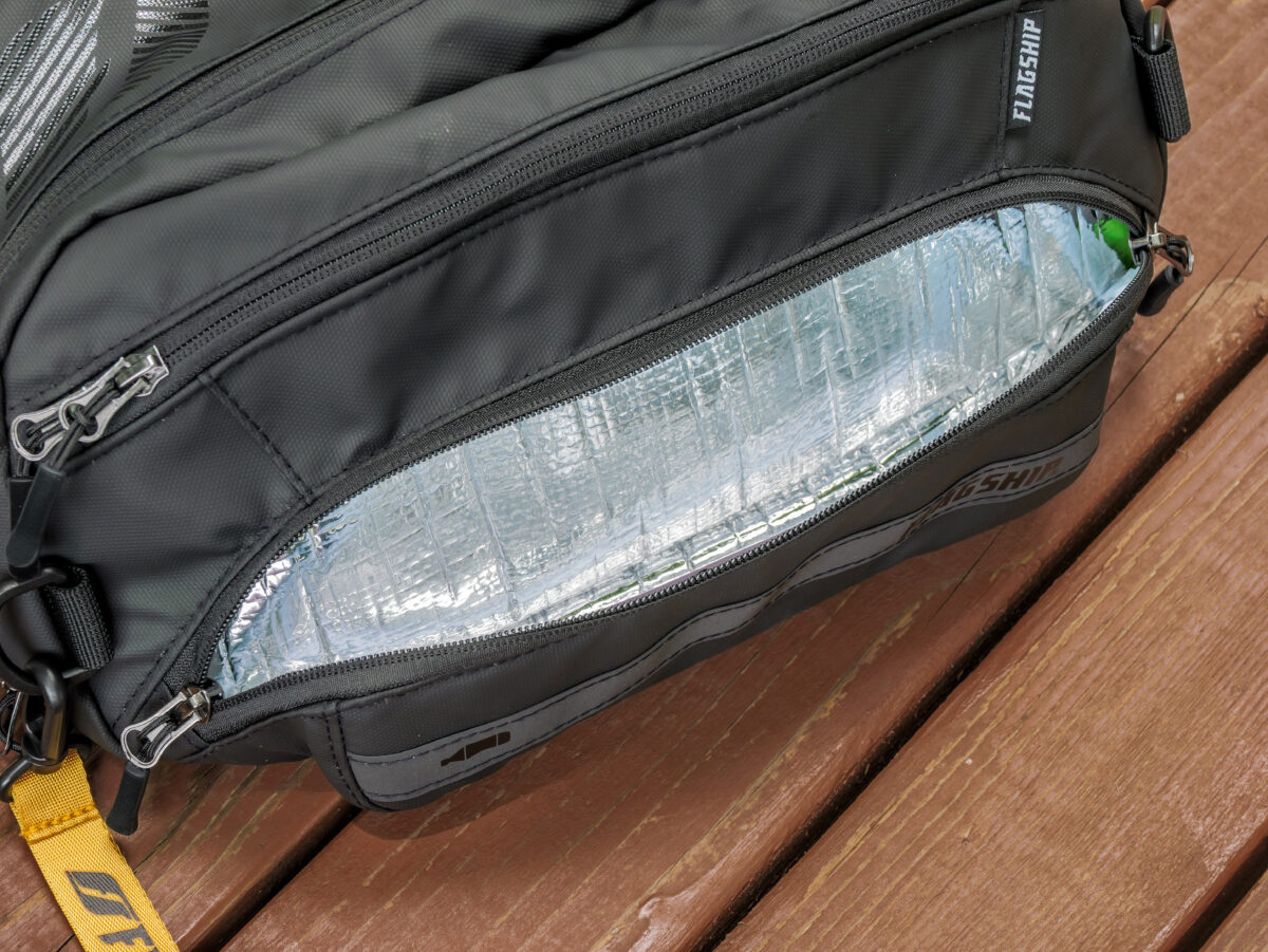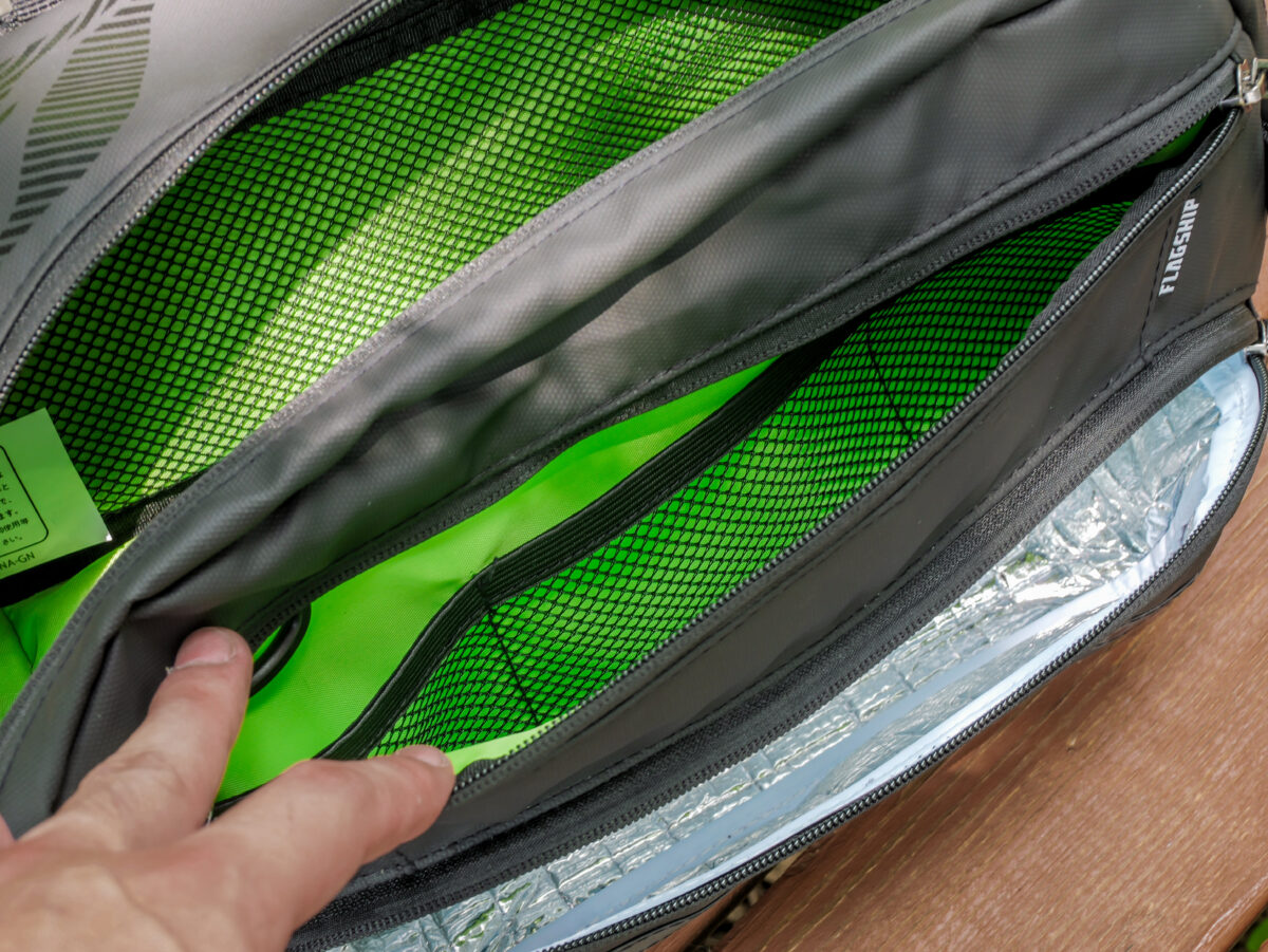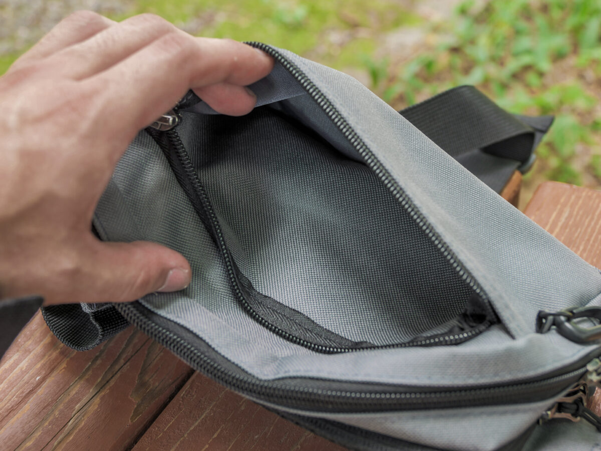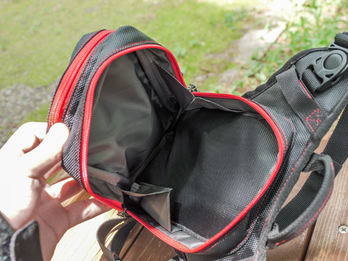 約6Lとウエストバッグにしてはかなり大容量となっている荷室は3つに分かれており、メインの荷室は2Lのペットボトルがしっかりと入る大きさで、手周り品からガジェット類まで、まとめてごそっと入れることができる。また、真ん中の荷室には内側にメッシュポケットが複数ついているので、細かいものを仕分けて入れておくのに便利だ。さらに、手前の荷室には500mlのペットボトルが収納可能となっており、こちらには保温素材が採用されているのでこの季節は重宝すること間違いナシ。