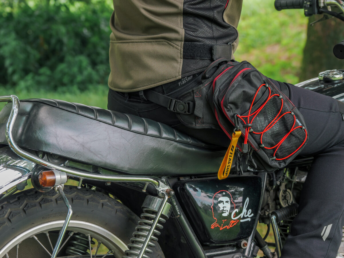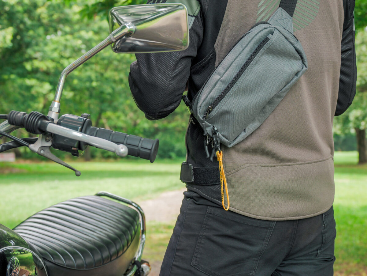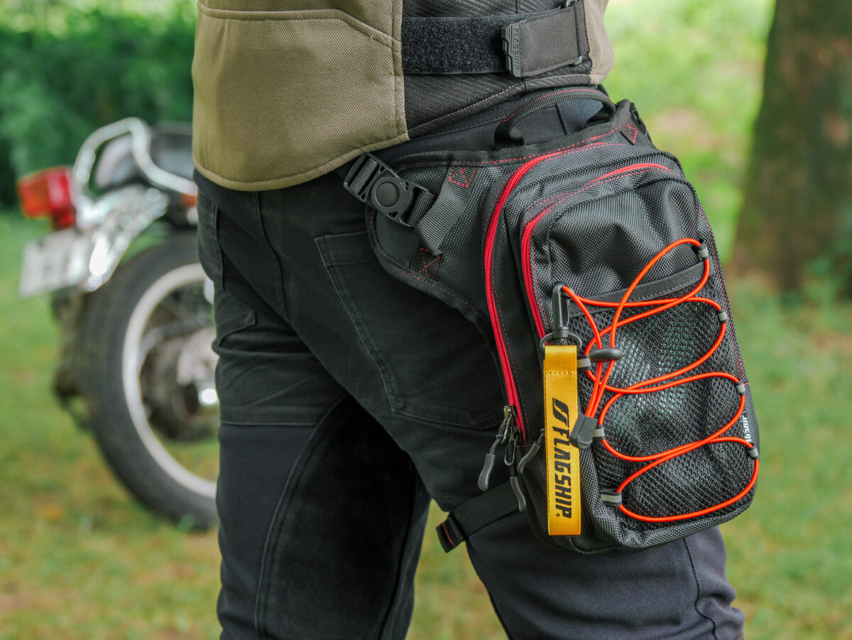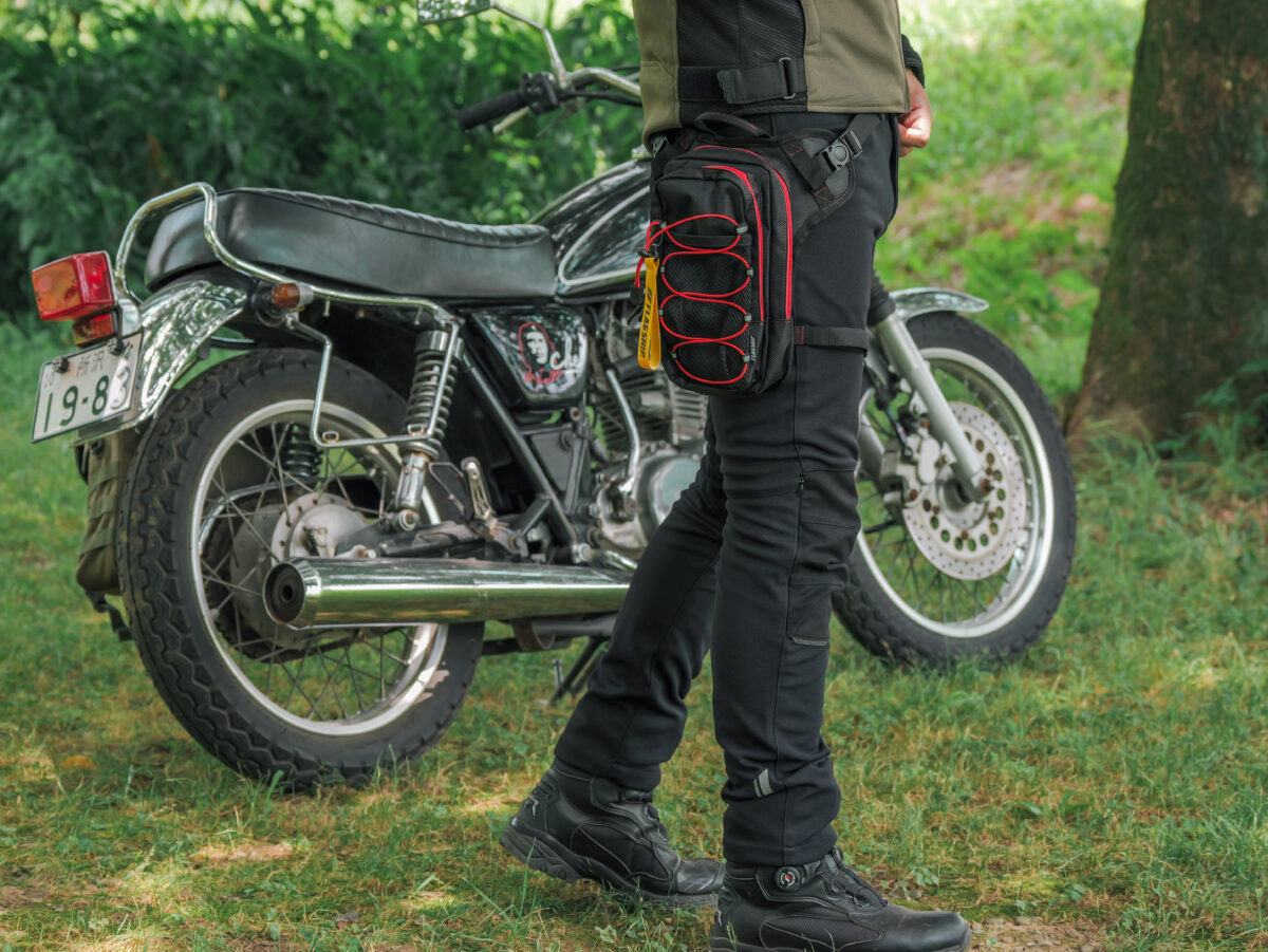 というのも、ホルスターバッグは身につけるバッグでありつつも、下半身に装着することによって通常のボディーバッグとは体への負担のかかり方が大きく異なり、乗車時にはほとんど負荷がかからないのである。まさに車載の手間がなく常に身につけておけるボディーバックと、車体に取り付けることで乗車中の身体への負担が全くないツーリングバッグの良いとこ取りをしたバッグなのだ。