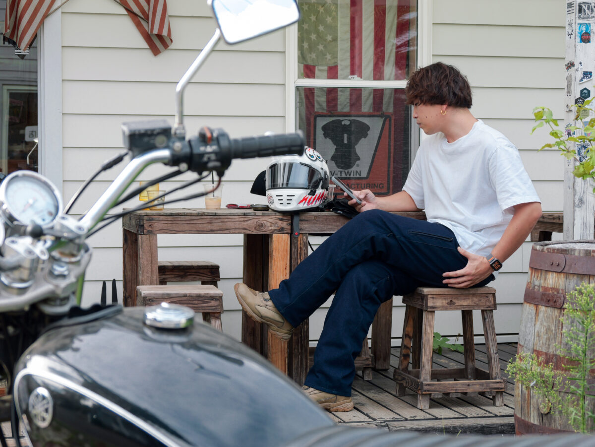 バイク用のパンツとしては珍しい身幅の広いシルエットが特徴的なワイドウインタージーンズだが、実際に履いてみるとスタイリングは自然で、オーバーサイズのTシャツと合わせるだけでシンプルで少ないアイテム数でもしっかりオシャレに見えるだけでなく、今どきらしいトレンド感が抜群に格好良い。