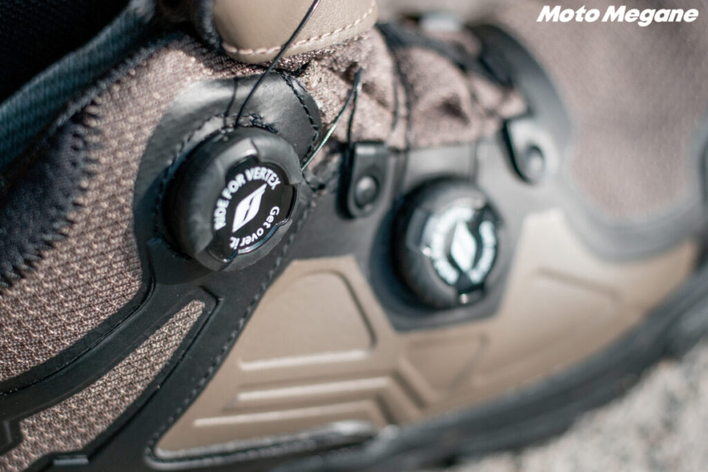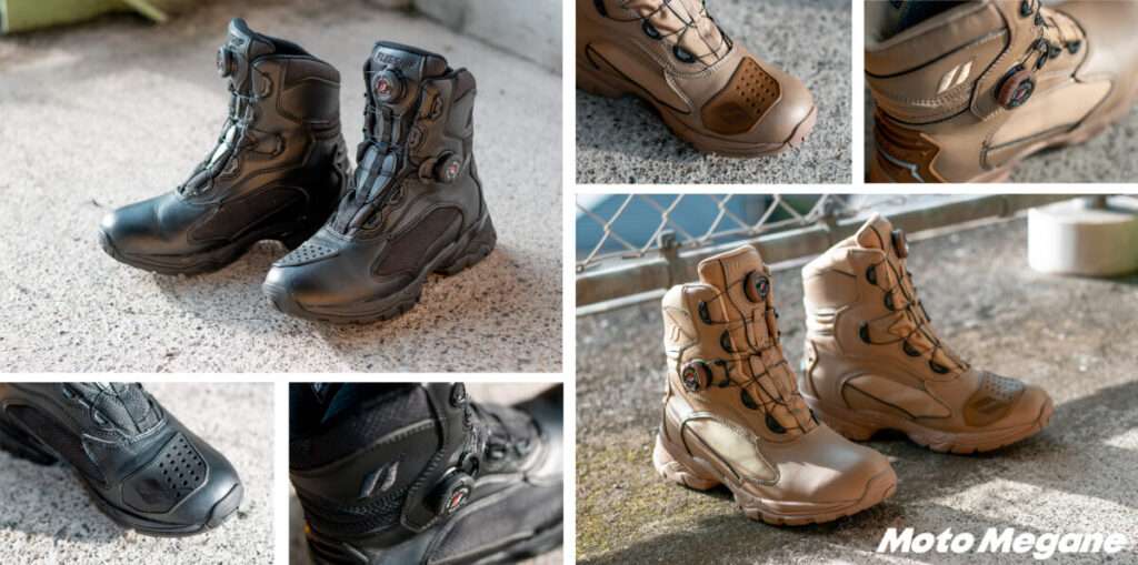 そして、フラッグシップのタクティカルライディングブーツやフィールドライドシューズをオススメしたい最大のポイントは、ゴツめの見た目に反して実際に履いた時の履き心地がとっても良いところ!しっかりしていながらも軽量なブーツは長時間履いていても疲れにくく、体重を分散させてくれる柔らかいインソールも歩きやすさに貢献。さらに、透湿防水フィルムの「ヴォクサーム」を採用する事で急な雨でも濡れてしまうことがなく、締め付け感を調整できるSPINONシステム(ワイヤーシステム)を搭載することによって、出先での脱ぎ履きも非常に簡単です!
