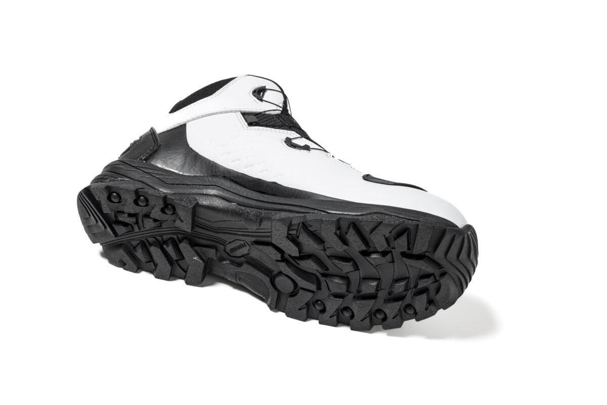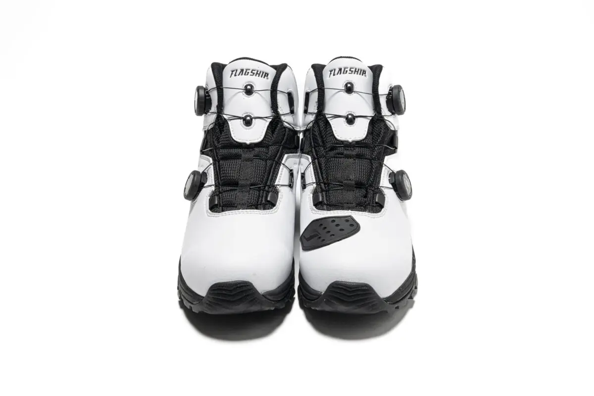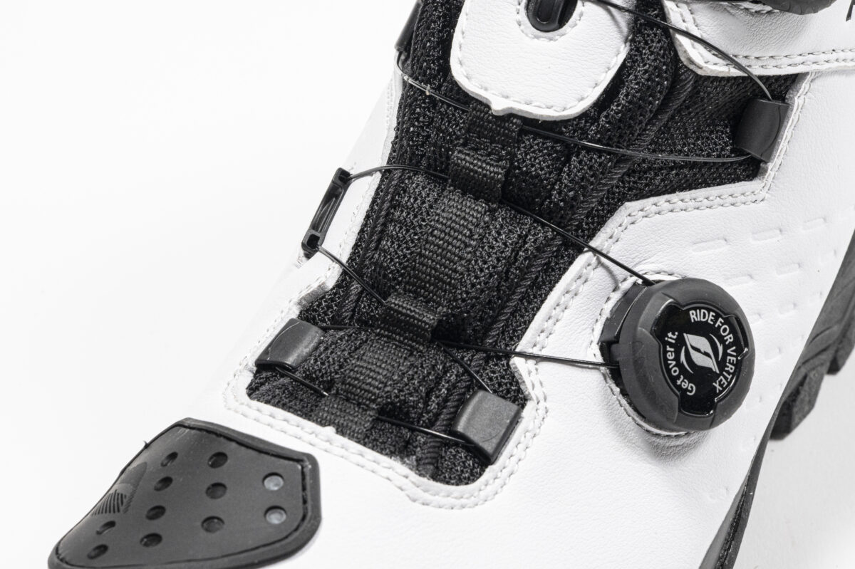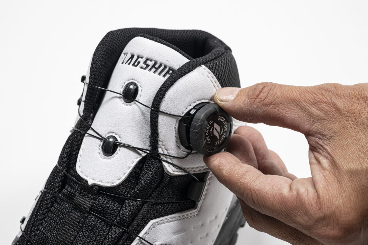 ストラテージ・ショートブーツが高い人気を誇る理由のひとつ、それが「SPIN-ONシステム」と呼ばれる機構です。シューレースやベルトバックルではなく、高い強度を持つ細いワイヤーを丸いダイヤルを使って締め付けることで、素早く確実にフィッティングを調整できるのです。