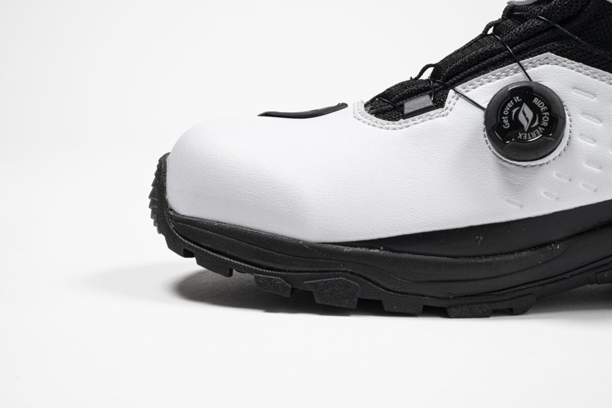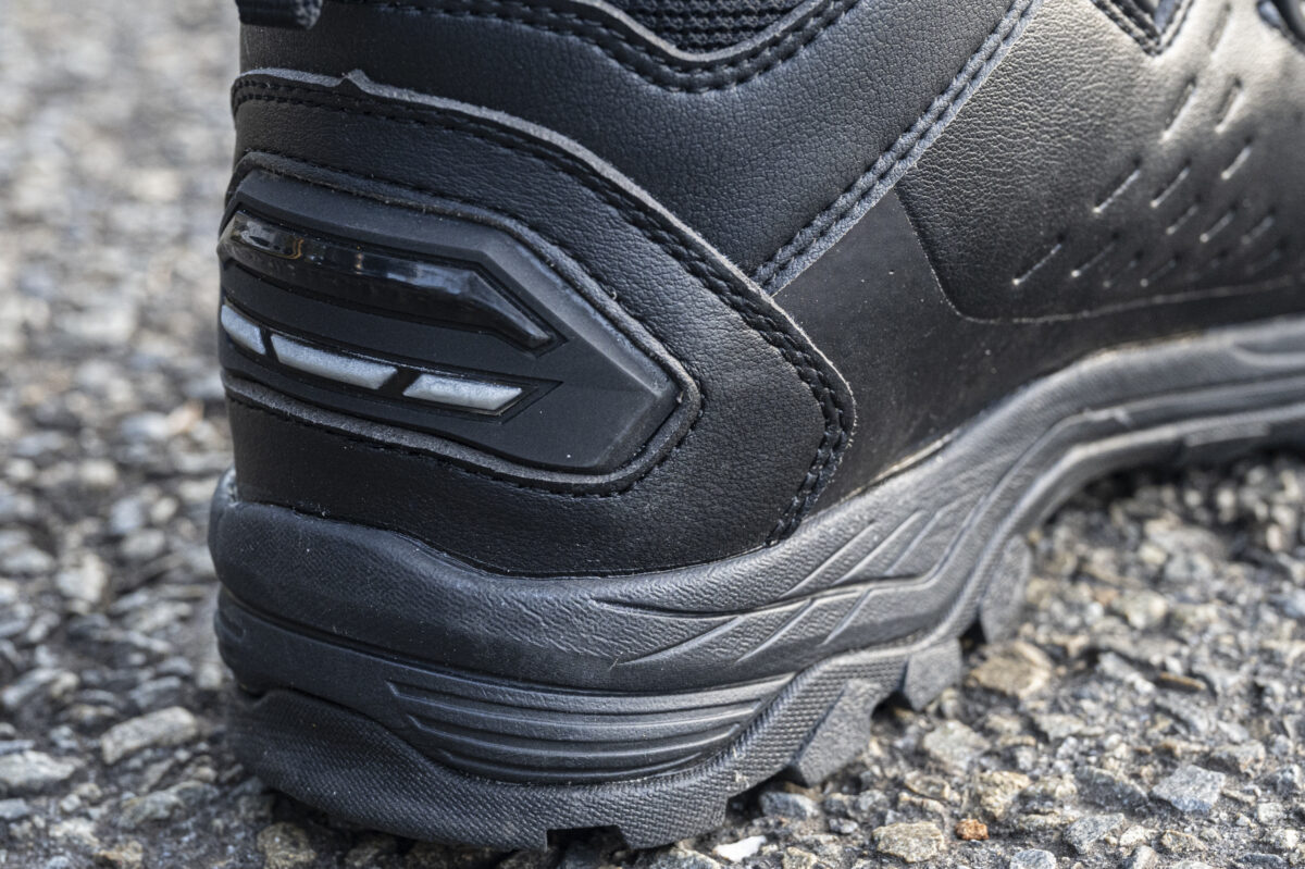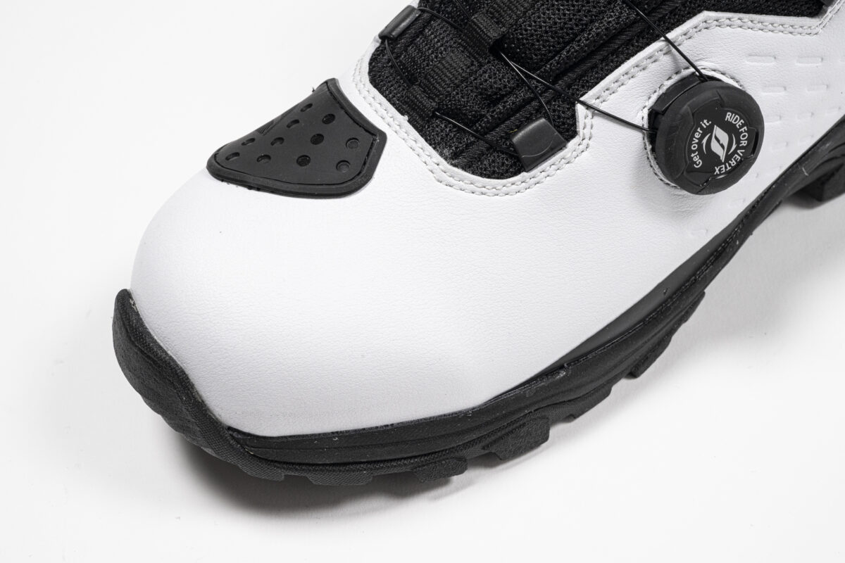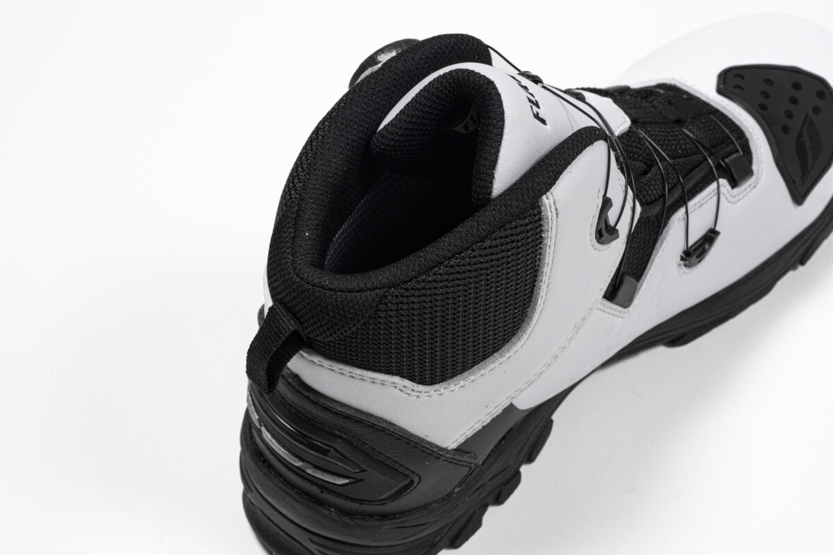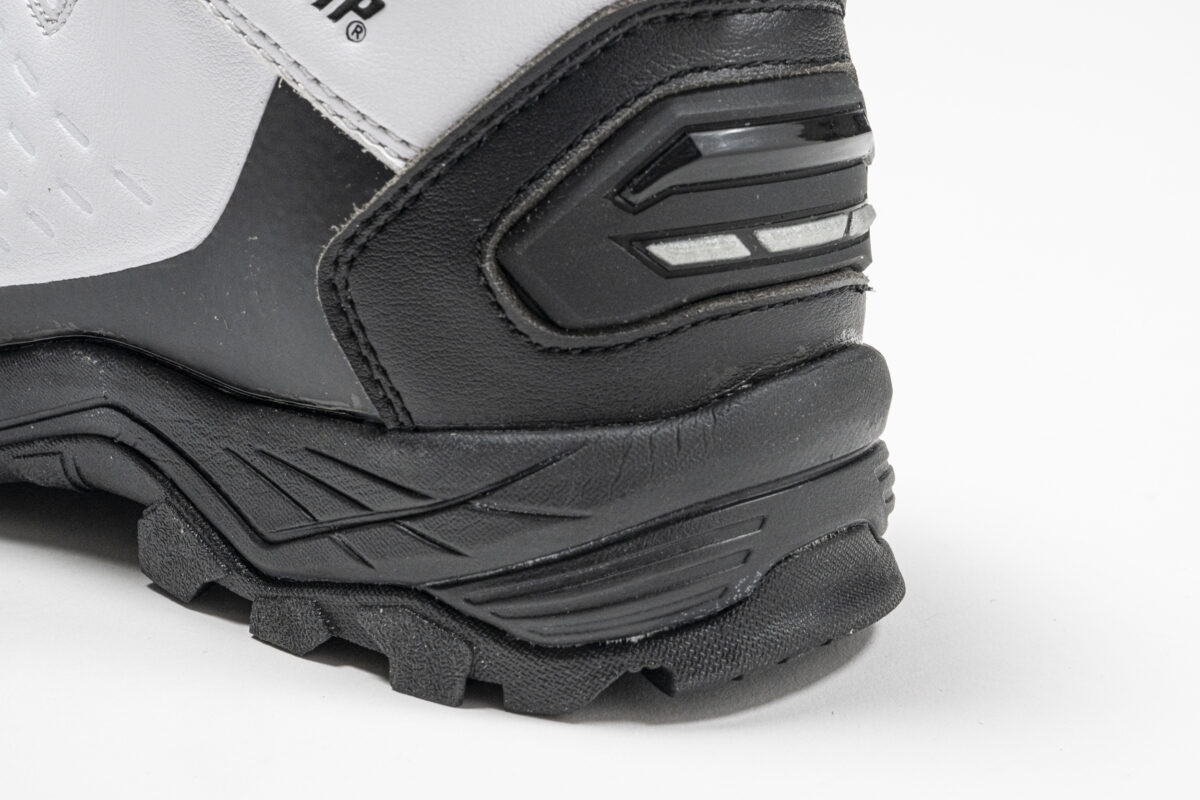 筆者はライディングの際にブーツの踵をステッププレートにピッタリとくっつけるタイプで、手持ちのスニーカーや他のブーツは踵の横側がかなり擦れてしまうのですが、このブーツでは適度に人工皮革の補強が入るほか、樹脂パーツもたくみに配置されています。
