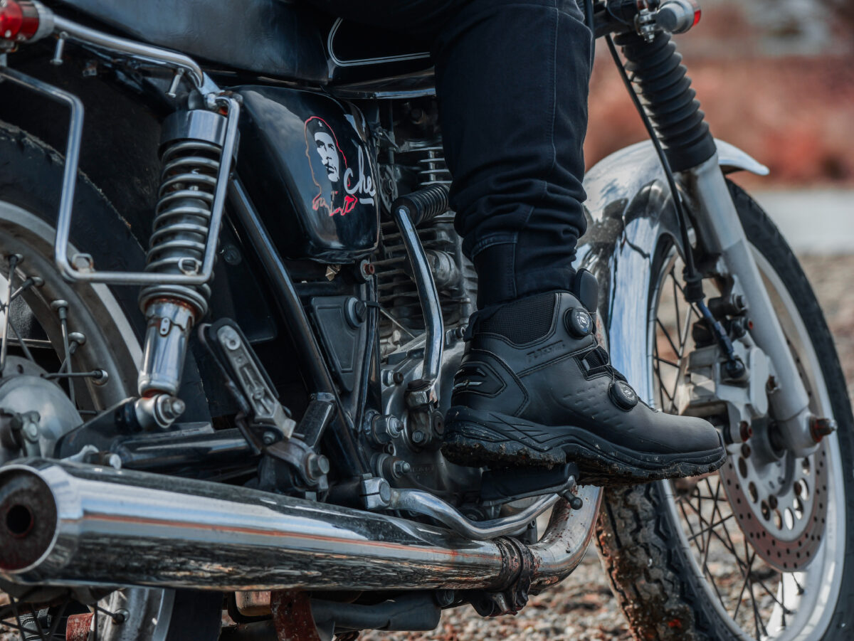 フラッグシップの展開するシューズでは1作目のタクティカルライディングブーツ、2作目のフィールドライドシューズに続き、3作目となるストラテージショートブーツは、タクティカルライディングブーツのようなミリタリーデザインを踏襲しつつ、ショート丈とすることで降車時も歩きやすく、足を入れる間口も大きく広がるので脱ぎ履きのしやすさも格段にアップ。
