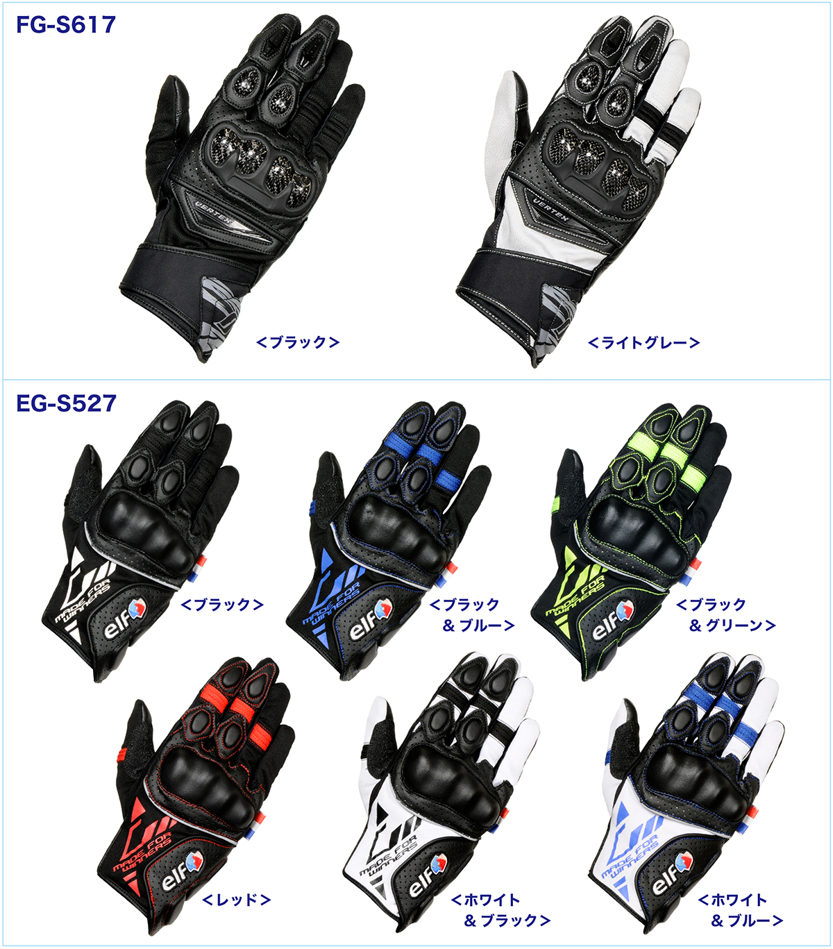 フラッグシップから届いたのは2種類。カーボンプロテクターを採用したフラッグシップブランドのグローブ【FG-S617】と、プロテクター部も合皮でカバーされたelfブランドのグローブ【EG-S527】だ。