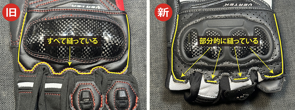 それが特許技術を用いた新システムだ。昨年モデルまではナックルプロテクターの指側をすべて縫いあわせていたのだが、今年のモデルは指の部分だけを縫う方式に変更している。