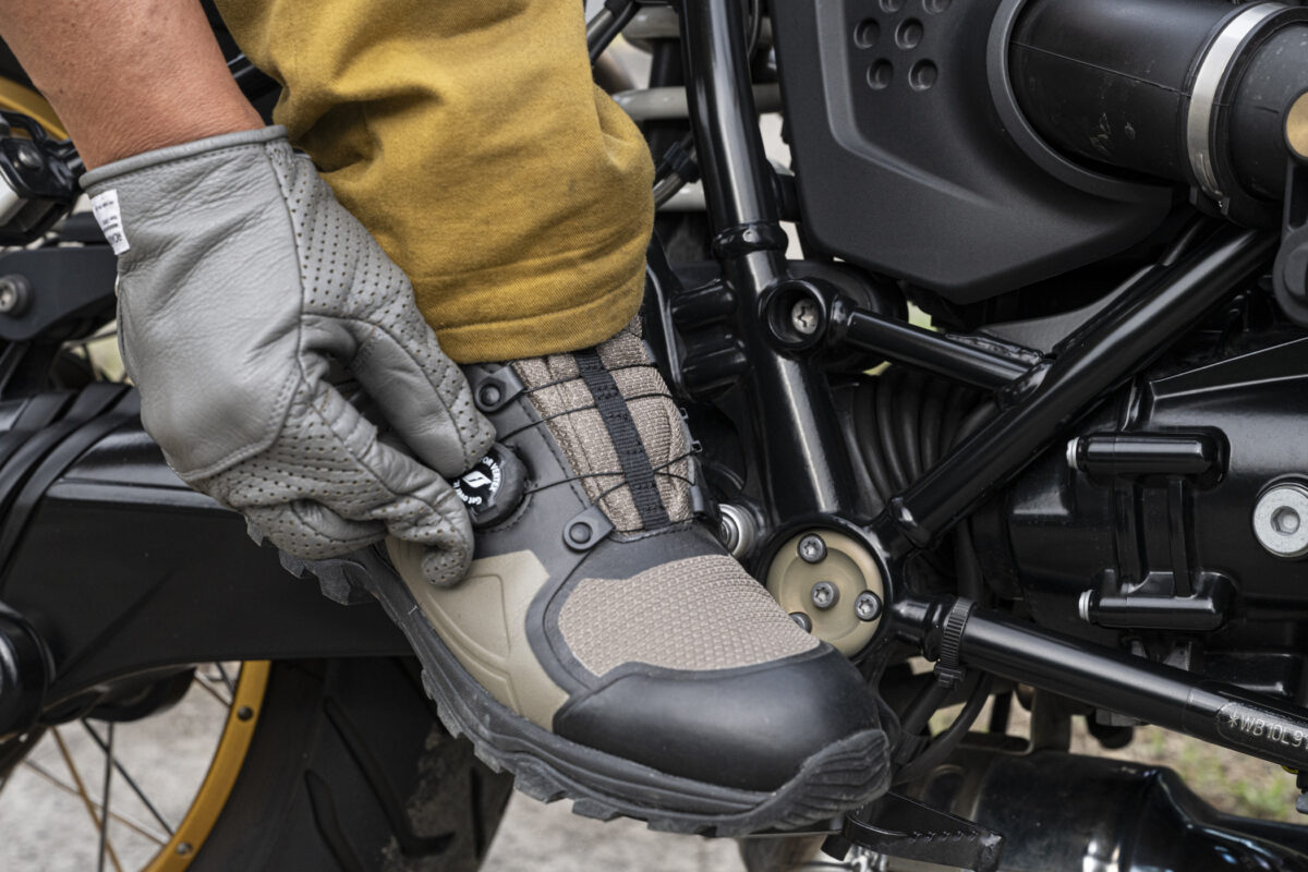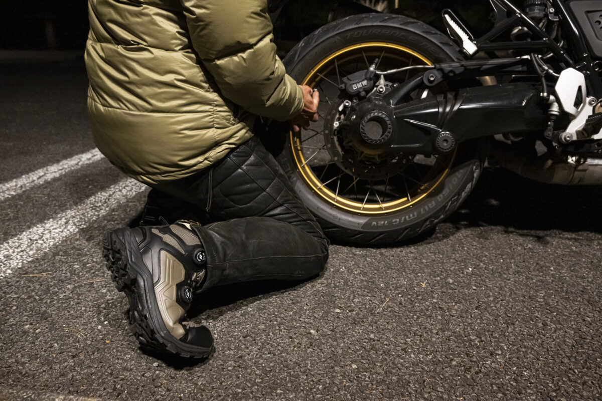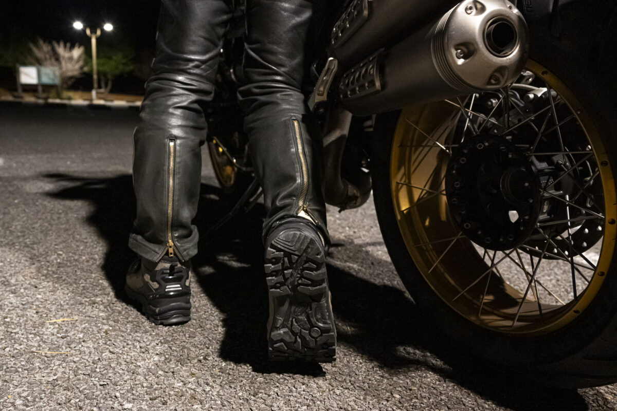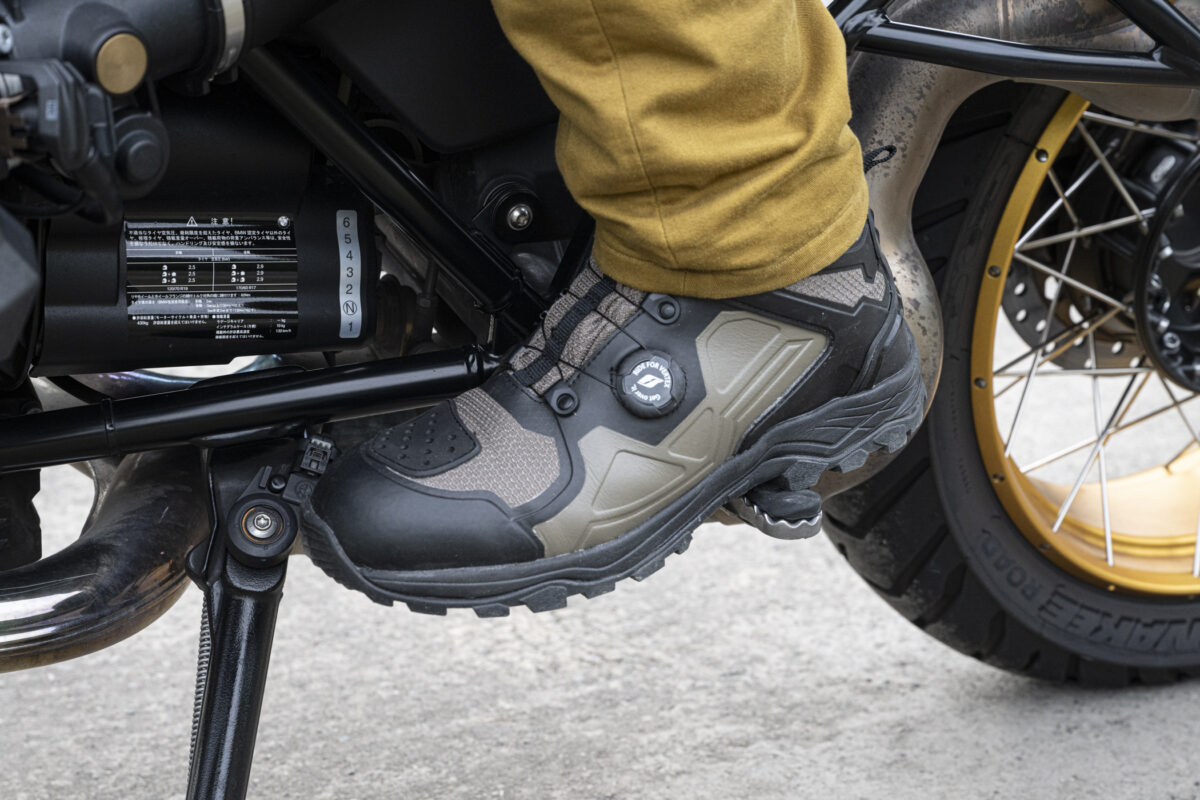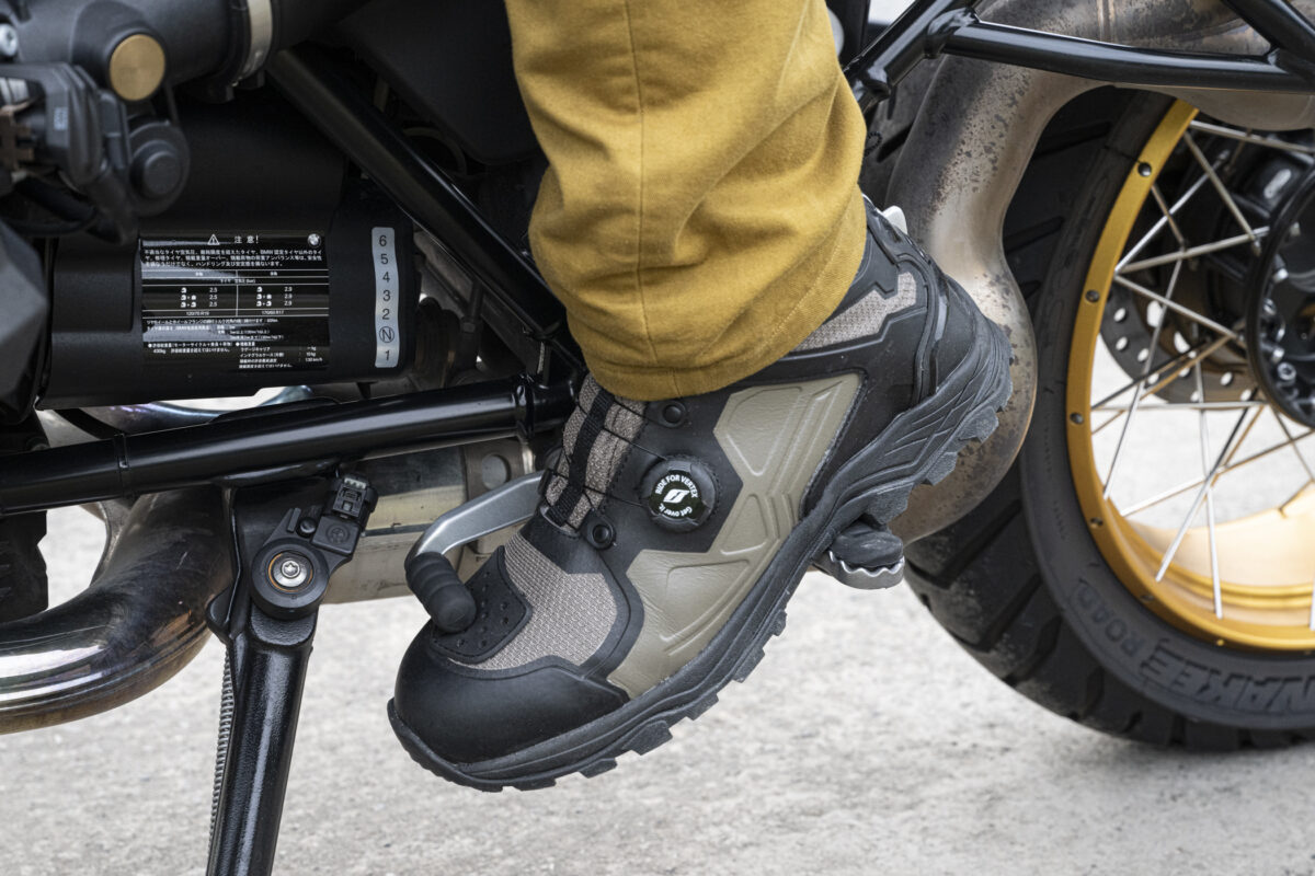過去には、このシューズを履いて、広い駐車場を数周押し歩きしてソールのグリップ力を確認しました。こういうシーンでのグリップ力がライディングシューズでは結構重要だと考えているのが筆者。じつは過去に、スポーツ系シューズを履いて愛車を押している時に、ソールのグリップが低くて足を滑らせてしまい、危うく愛車を倒しそうになった経験があります。みなさんも、ライディングシューズを選ぶ際には、ぜひともソールのグリップに注目してほしいところです。