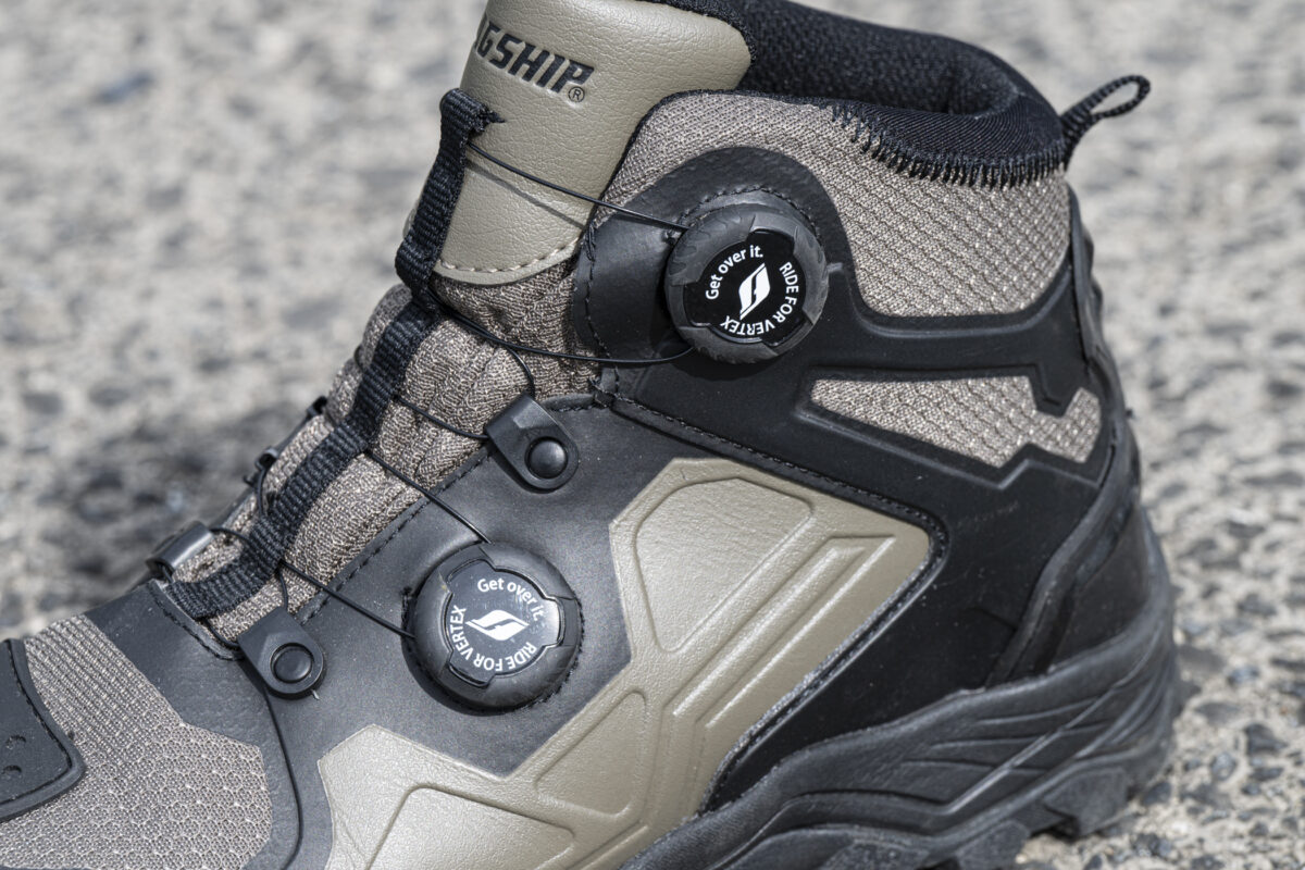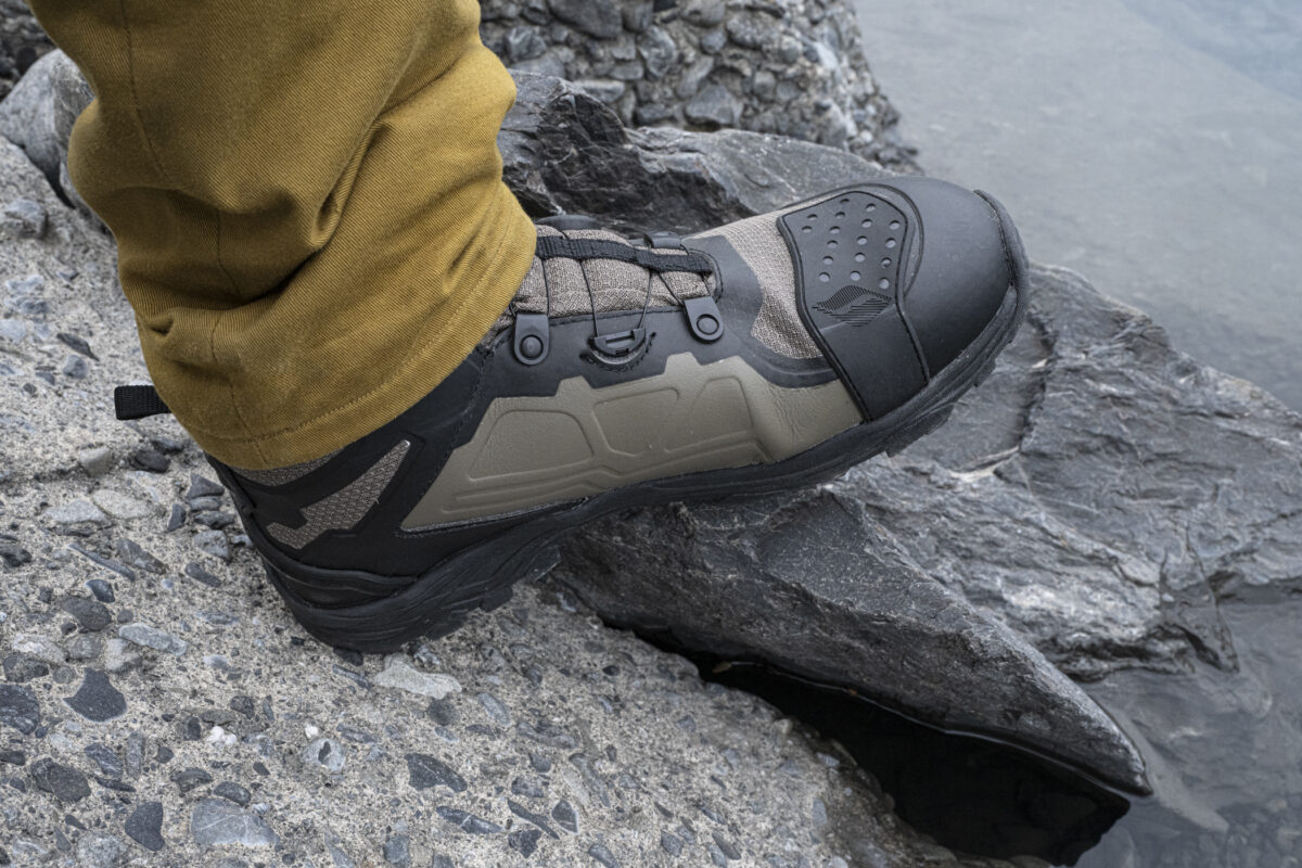 フラッグシップのフィールドライドシューズが搭載するフィティング機構が「SPINONシステム」と呼ばれるものです。シューズ外側に2つのダイヤルを装備、ダイヤルを時計方向に回すとワイヤーが締め付けをおこないます。緩めるときはダイヤルを引っ張り上げるだけ。この操作性は普段の脱ぎ履きでも超便利!