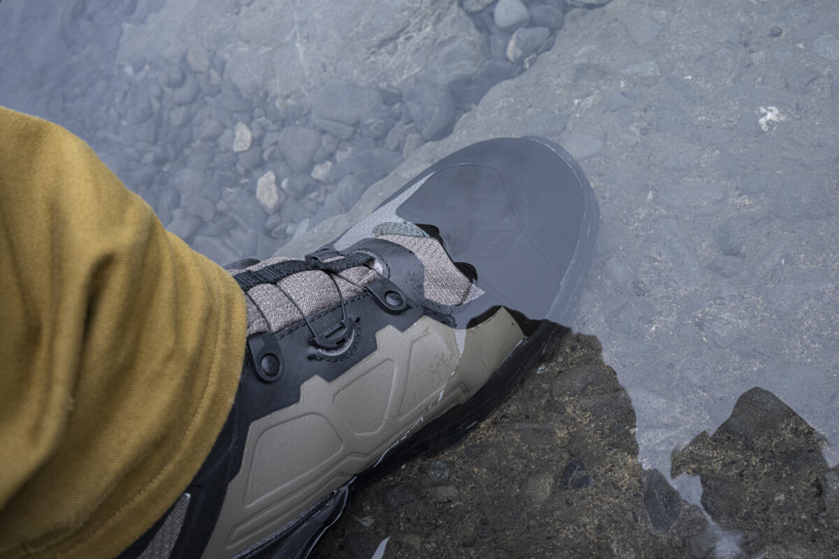 つい我慢できずに、やってしまいました。川辺にはちょっとした浅い水たまりがあり、そこにシューズを突っ込んで防水力を試してみたのです。フィールドライドシューズは透湿防水フィルムの「ヴォクサーム」を採用した防水力にも定評があり、これまでも豪雨での走行でその防水性は確認していました。とはいえ、水たまりに足を突っ込むようなテストはしていませんでした。