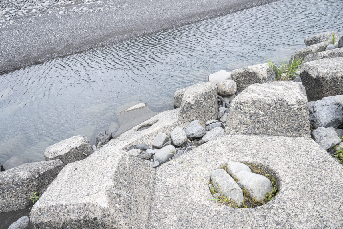 足場は天然の石とコンクリート製の堤防が組み合わされており、特にコンクリート部は、ソールの素材や形状によっては滑りやすそう。石やコンクリートが濡れていたらなかなかスリリングな場所ですが、何の不安もなく歩き回ることができました。