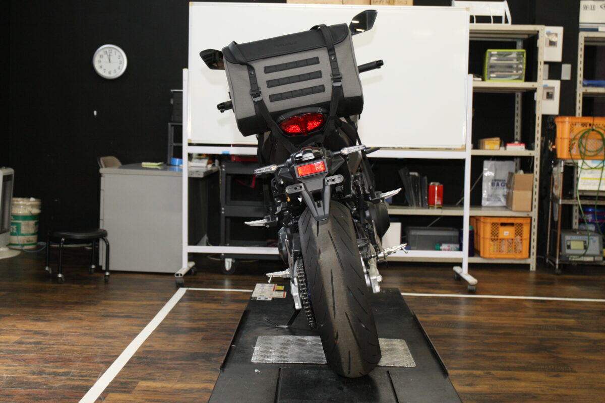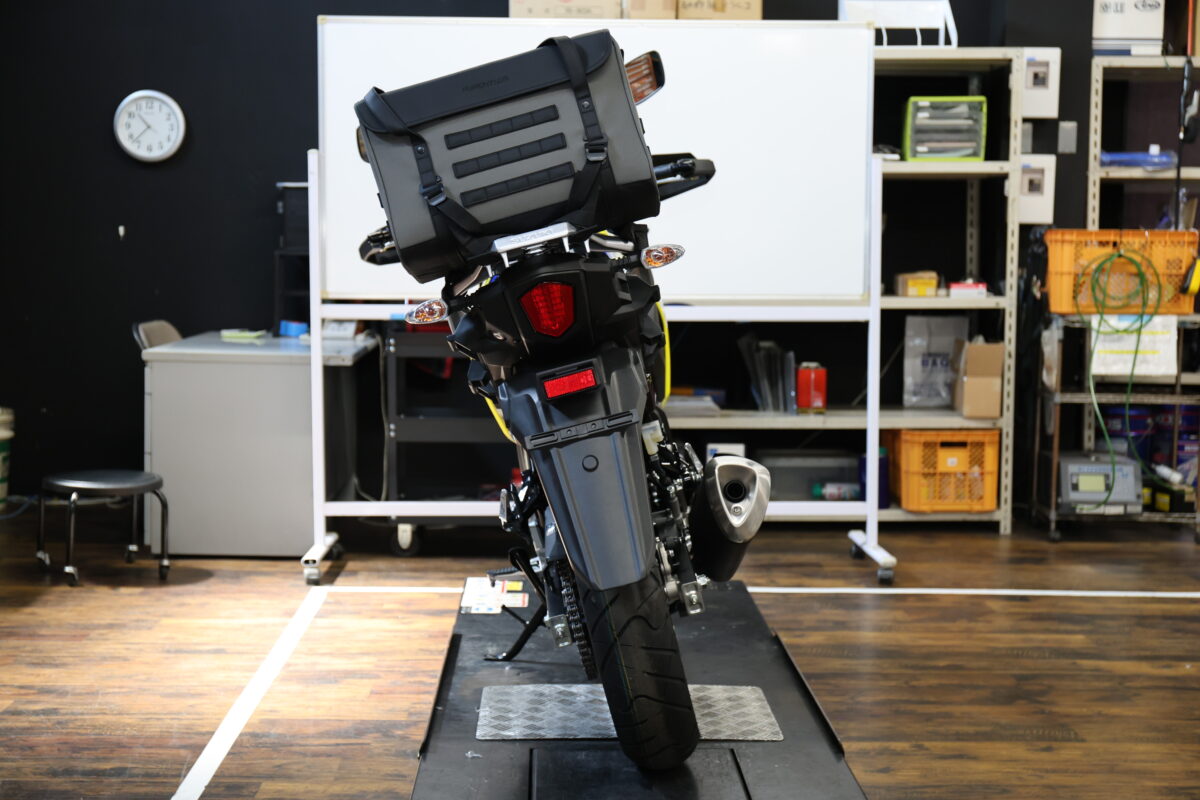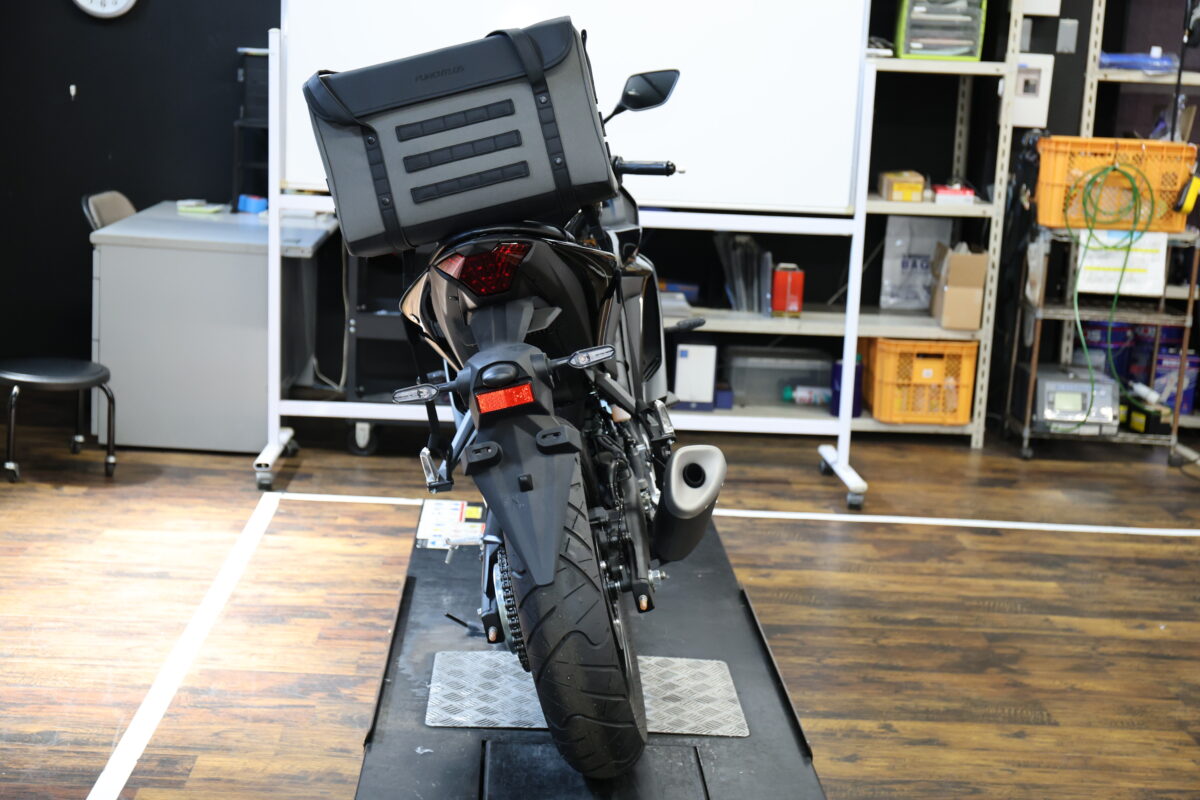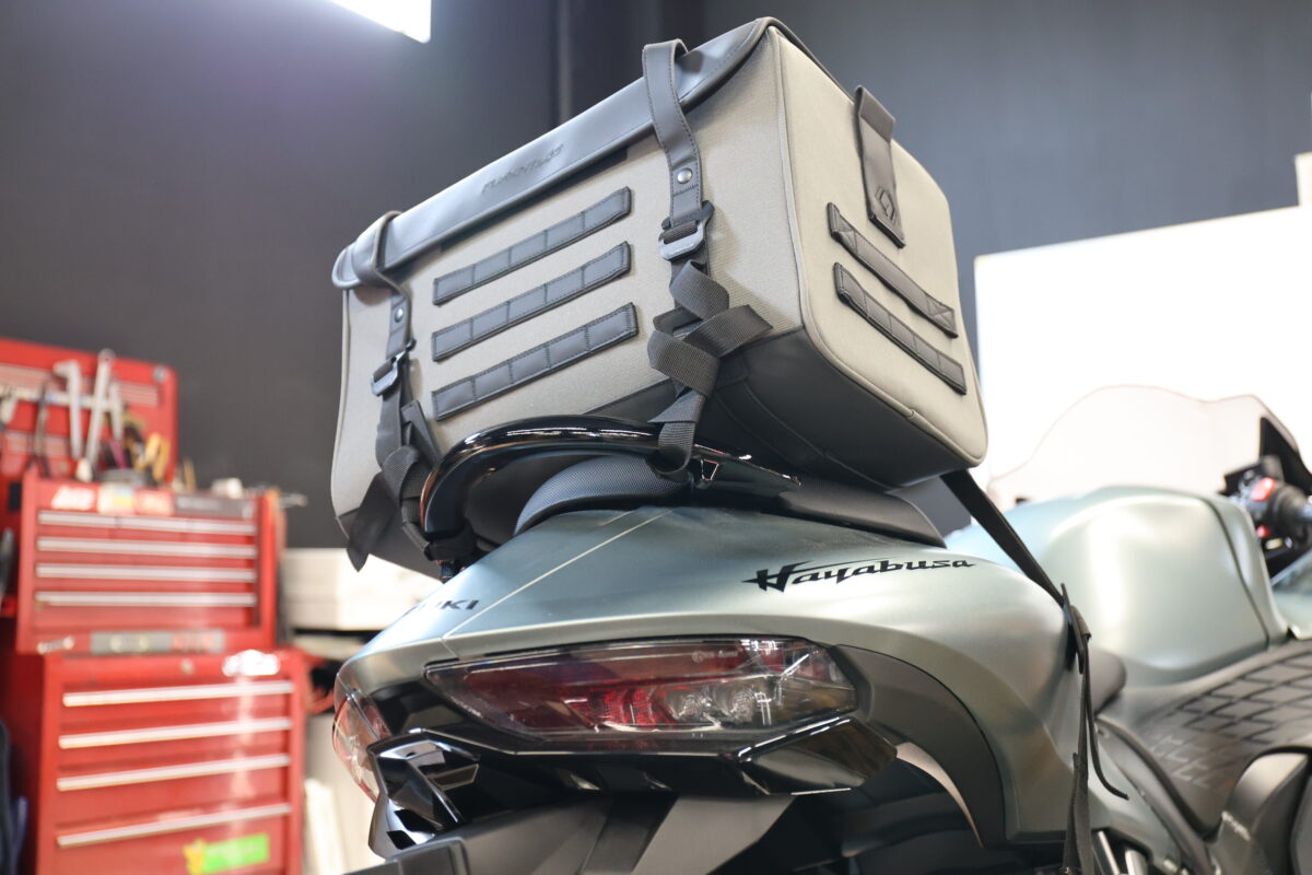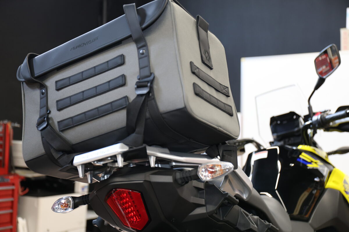 フルヒトロスのデザイン的な汎用性の高さ、取り付け方法としての汎用性の高さをチェックしてみよう。今回は32リットルサイズを使用した。車両はバイク館川口店にお邪魔して、テストをさせていただいた。バイク館については最後に紹介をするので、併せて見てほしい。