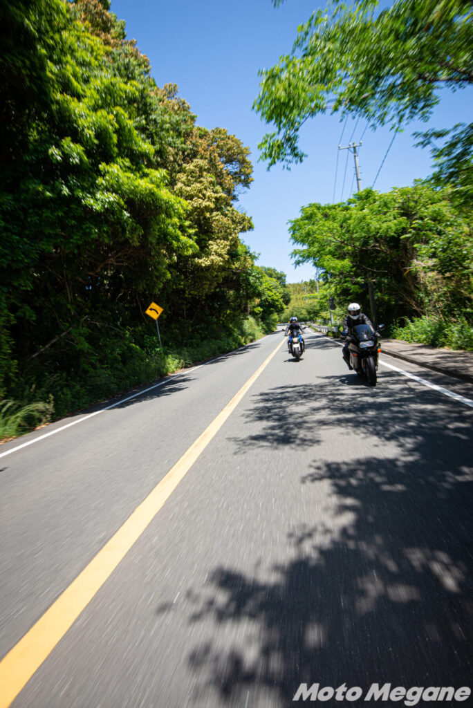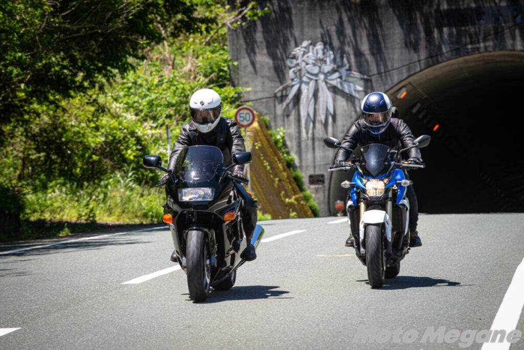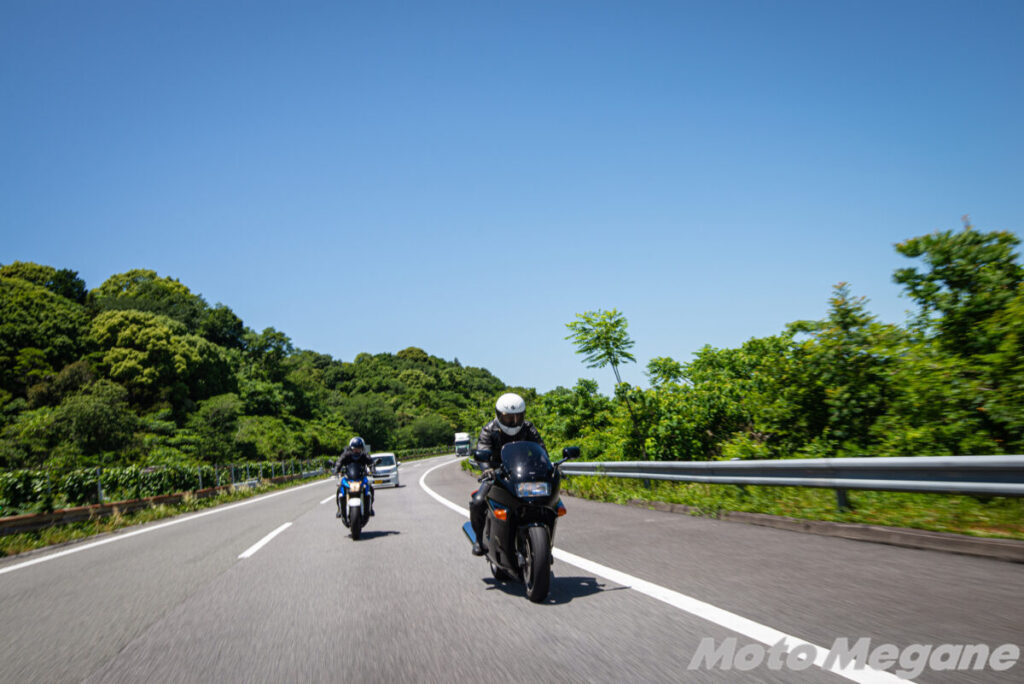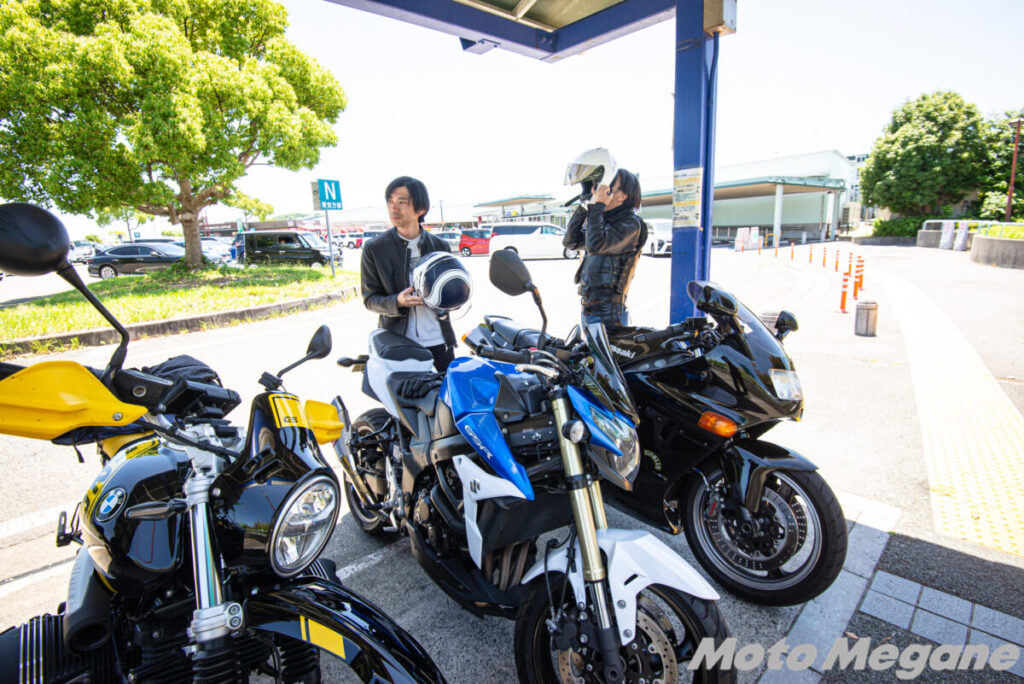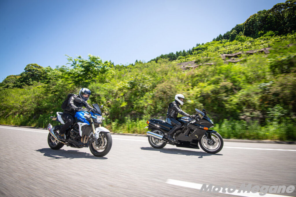 カウル付き高速ツアラーのZZR1100、スポーツネイキッドのGSR750、ヘリテイジスタイルのアーバンGSとまったく異なるジャンルのバイクでツーリングへ出かけます。ライディングポジションはもちろん、カウルの有無、快適な巡航速度も異なる3台です。