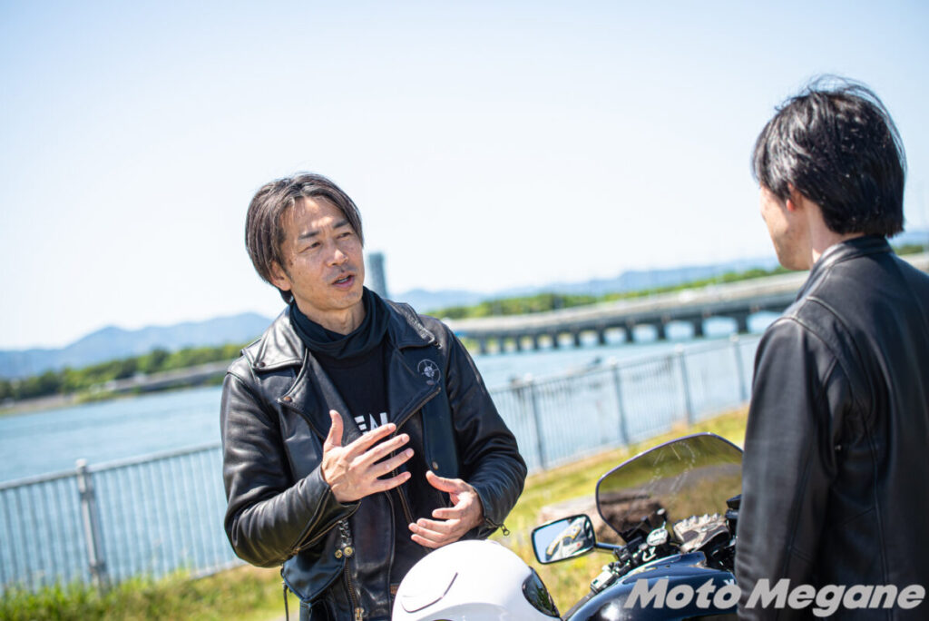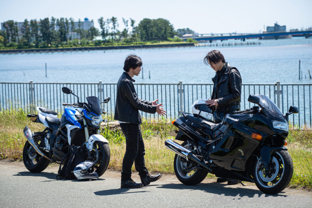 右が代表の泉地さん。ZZR1100オーナーはストックのスタイルを保つ極上美車! 左はスタッフの岩井も。愛機GSR750はカスタム済みで、もっぱら休日のツーリングに使用。