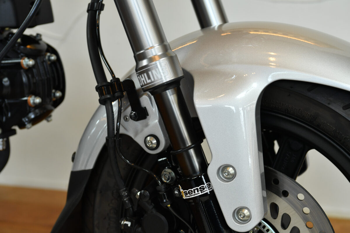 「このDAX125はリヤサスも変えていますが、フロントだけでも劇的に変わります。色を変えて遊べるので、カスタムとしてもおすすめです」