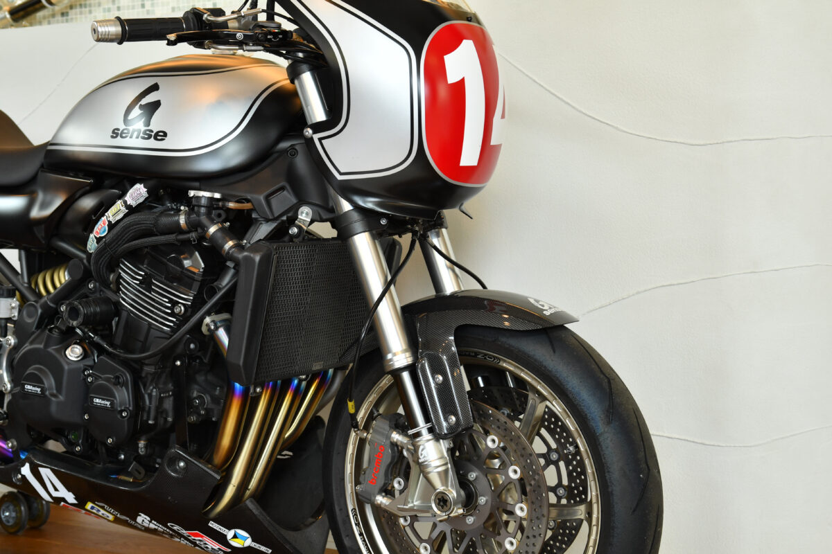 「Z900RSはカスタムベースとしても大人気ですが、フロントブレーキをかけるとストロークの半分まではグッと入るのですが、そこから先が入らずストロークが止まる感じがするんです。そうした不満に応えるために、Z900RS用に適合する41φ倒立フロントフォークの作成をオーリンズに依頼したのですが、オーリンズは作らないと。それならとG sensse初の自社製品として開発したのがG-Fork41φです。僕もZ900RSに装着して、テイスト・オブ・ツクバに参戦し、性能もちゃんと出しています。ノーマルと同寸法で作っているので、ボルトオンで装着できます。オプションで色を変えることもできます。MT-09、KATANAにも対応しています」