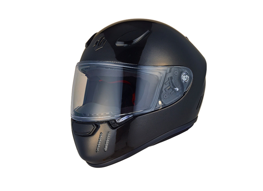 ポリカーボネートシェルを採用し、格納式サンバイザー(ブラックダークスモーク)、ベンチレーション、シングルボタン開閉式チンバー、スピーカーホールとシステムヘルメットに要求される装備を網羅。高い質感も魅力だ。