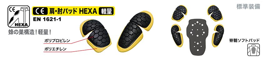 肩と肘にはヨーロッパのCE規格をクリアした「HEXA」のプロテクターを装備。