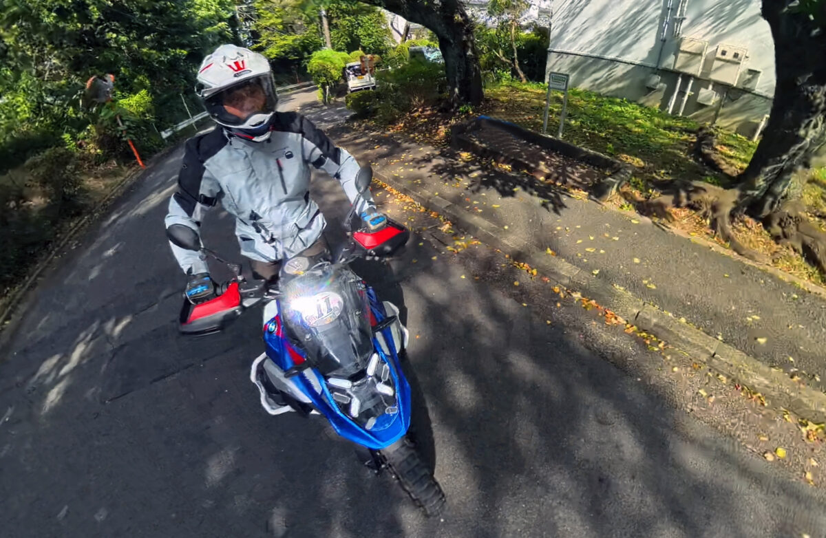 今回はメーカーに許可を得て、実際にエアバッグを体験できることとなった。キーボックスから出たワイヤーをR1300GSのエンジンガードに固定して、ライダーが降りた状態で一気にキーボールを抜く。