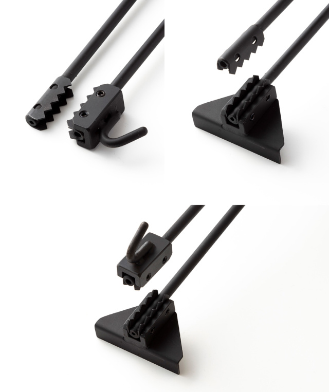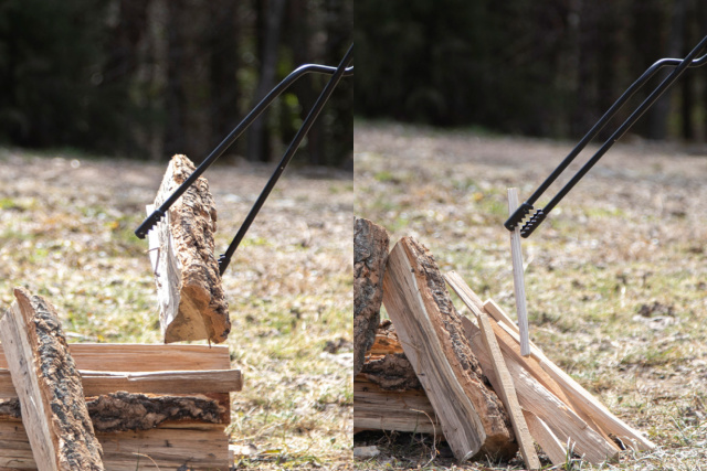 薪を操作する火バサミと、空気を送る火吹き棒の機能を兼ね備えている。さらに、オプションのフックと灰かきを装着すると、引っ掛ける&かき出す機能も加えられる。