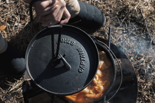 「フック」を装着すれば、ダッチオーブンの持ち手を引っ掛け移動させたり、蓋の開閉にも使える。