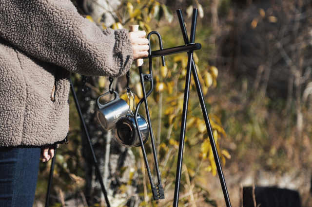 湾曲した持ち手部分はハンガーラックに掛けておけるので、キャンプにありがちな「あれ…どこいった?」を防ぐことができる。
