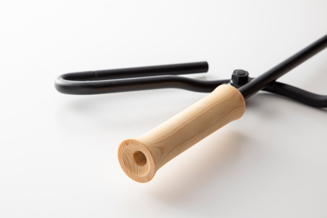 グリップ部は岐阜県産の東濃ヒノキを使用。強度・耐朽性に優れたヒノキは熱伝導率も低く、冬場に手で触れた時に〝ヒヤッ〟とするのを防いでくれる。