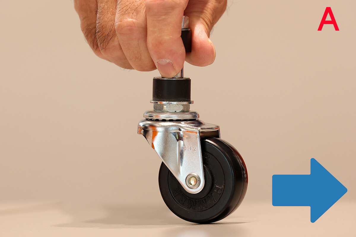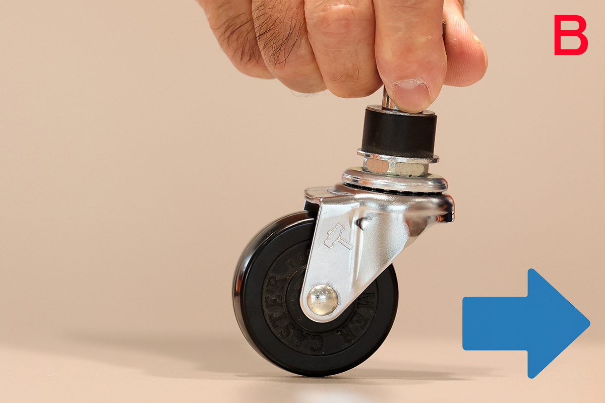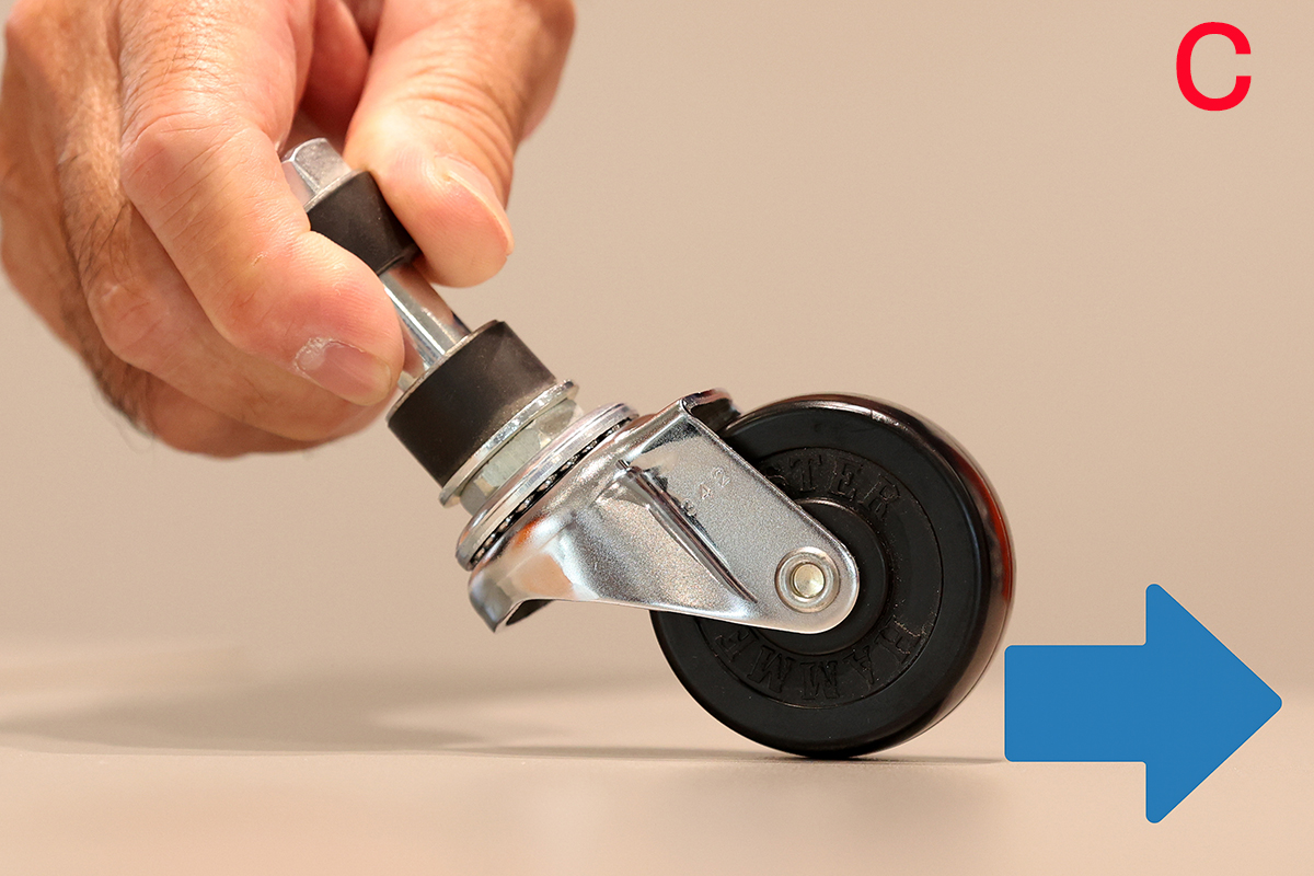 「バイク以外の身近にある物で、トレールの役割と重要性を直感的に理解しやすいのが台車のキャスター。一般的な台車のキャスターは、転舵軸を直立させた状態で車軸側に押すと、車輪がくるりと反転します。これは、当初の状態だとトレールがマイナスだから。でも、キャスター部の転舵軸を写真Cのように傾ければ、トレールがプラスとなり、転舵軸よりも前に車軸がある状態で押せるようになります。また、写真Cの状態で傾ける角度を変化させることで、直進性に違いが生まれることも体感できると思います」
