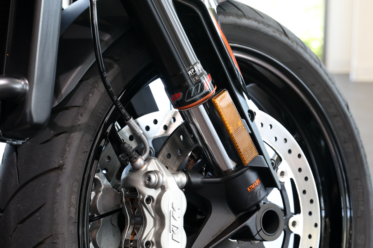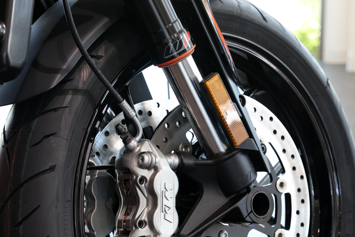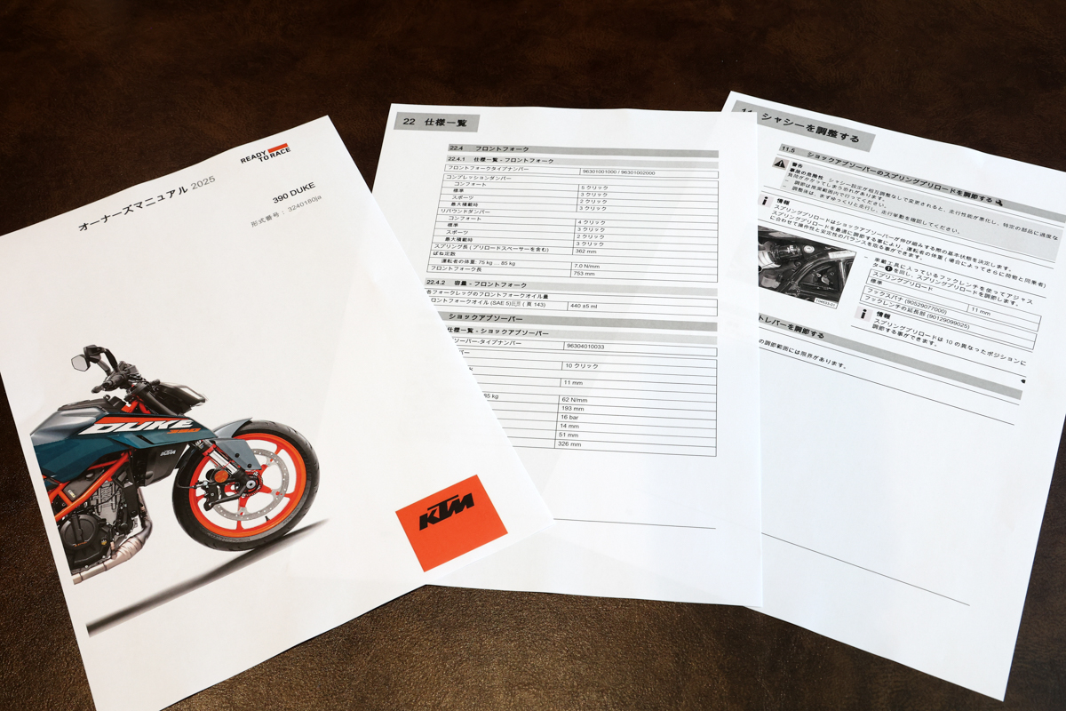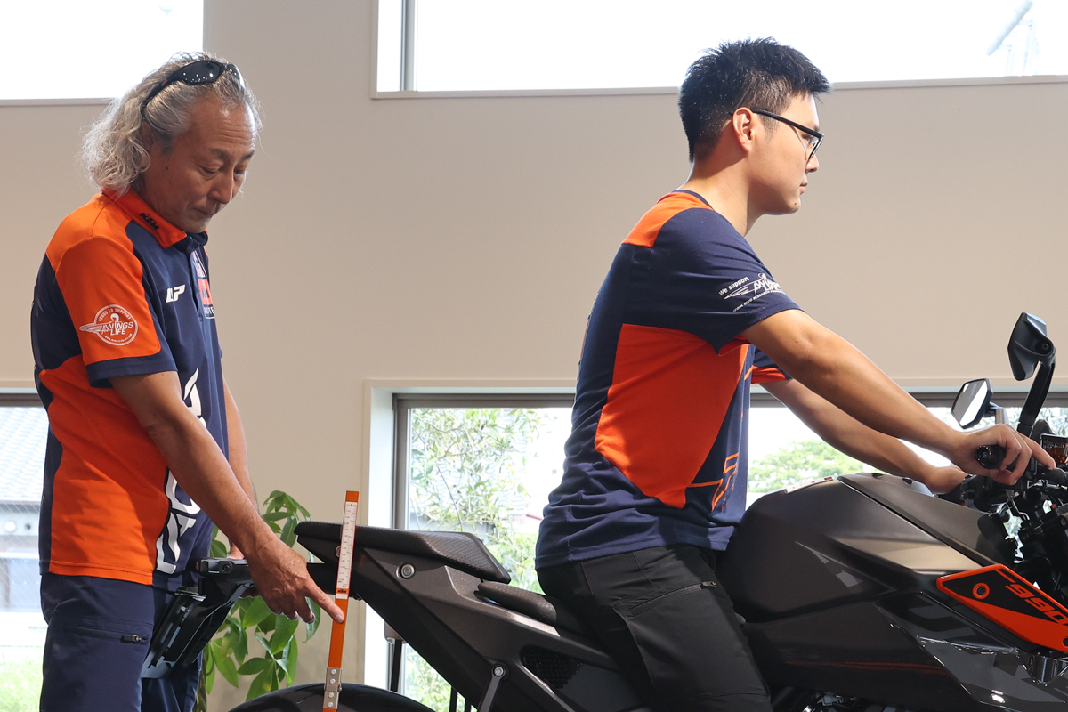 「欧州メーカーのKTMやハスクバーナは、体重75~85kgのライダーを想定して開発されており、これは日本人の平均体重よりも重めなのでサスペンションが沈みづらい傾向ですが、スタンダードでも気持ちよく走れる設計です。当社がオススメしている自分専用のサス調整は、体重70kgまでのスプリングにセットした試乗車で軽快なハンドリングと快適な乗り心地を体感された方のほとんどがリクエストされます。KTMやハスクバーナは、前述した0Gでのサスペンション長や1Gおよび1G’でのリヤサスペンション沈み込み量が、推奨値としてオーナーズマニュアルに当然のように記載されているメーカー。これはスモールデューク系まで全車種共通です。そのため、足着き性に問題を感じていなくても、体重が軽いまたは重いライダーが乗ったときにその数値が得られるようなスプリングに変更することともオススメします」