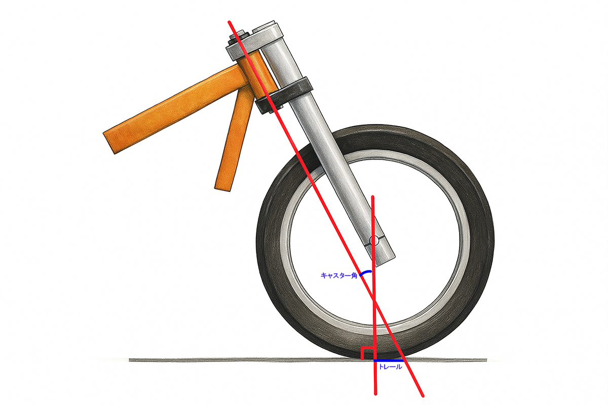 このように解説するのは、メンテナンス専門ショップのIMPALA(インパラ)を1993年に創業するなど、バイクメカニックとして極めて豊富な経験を持つ山鹿延也さん。「キャスター」に「トレール」と、ちょっと難しい用語が出てきたので説明しておくと、キャスターはステアリング中心軸の傾きを表わしていて、地面に対する垂直線との角度となる。トレールは、フロントアクスルの中心を通る垂直線の接地点と、ステアリング中心軸線を延長した接地点の距離を示す数値となる(※図参照)。