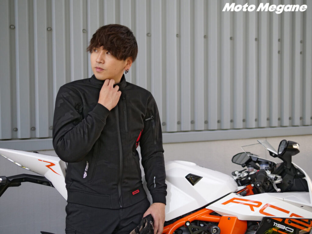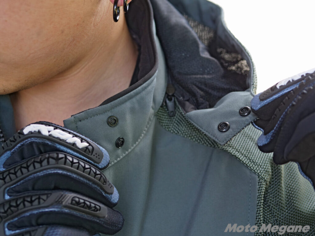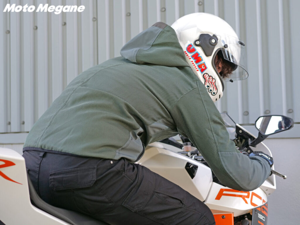 また、ハードメッシュのしっかりとした生地感の表地は非常に風通しが良く、胸周りや袖には動きやすいソフトシェルが採用されているので、スーパースポーツの前傾がキツい乗車姿勢をとっても窮屈な感じはせず、バイクから降りた休憩時や街歩きをしている時も快適に過ごせそう。