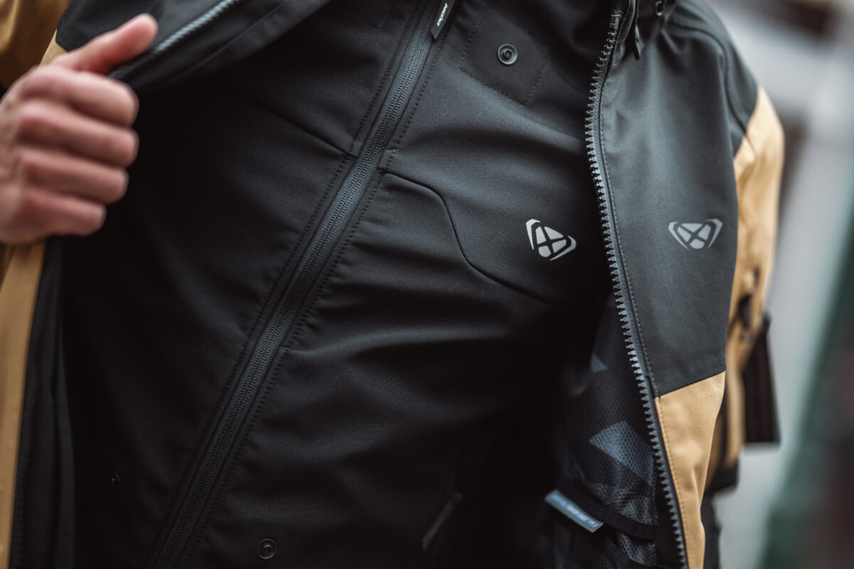 肩とヒジにCEプロテクターを標準装備するほか、胸部にもオプションのプロテクター用ポケットをもつ。