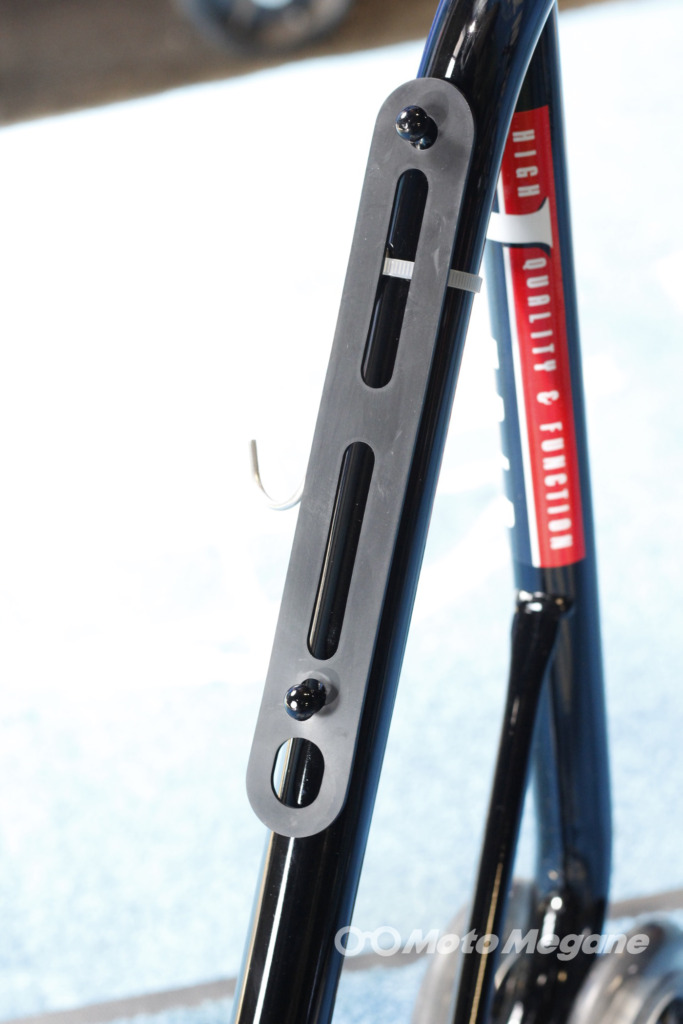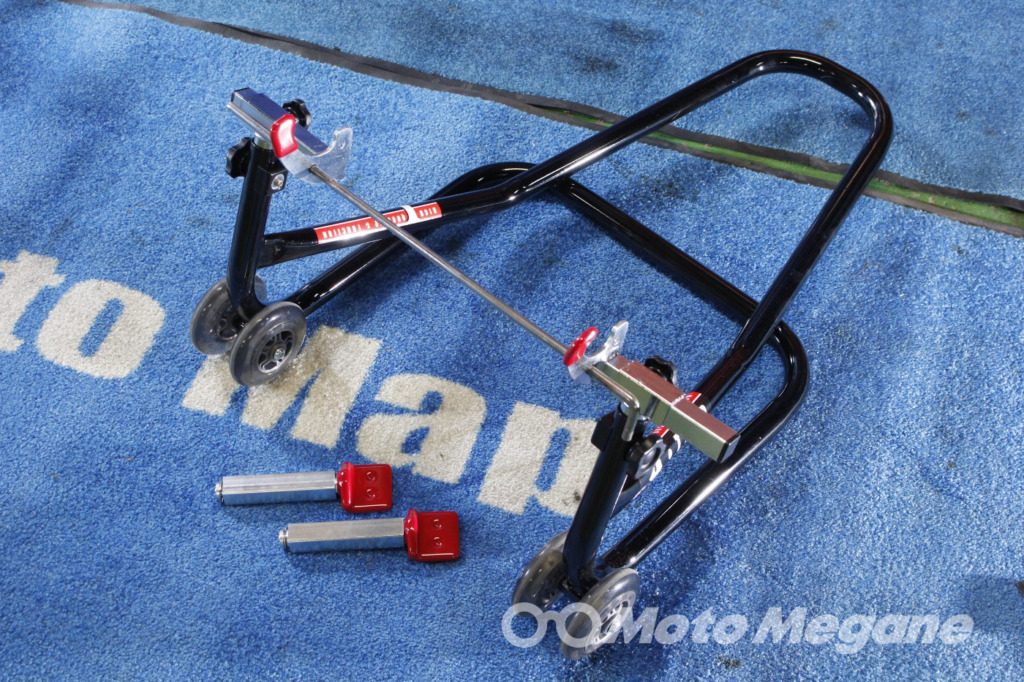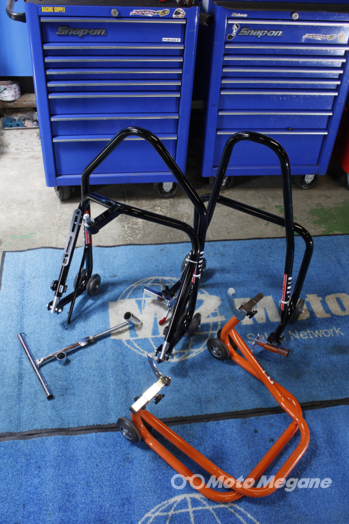 畑中メカニックが十数年レースの現場で使ってきたスタンド。塗装の剥がれこそあるものの、全く壊れる気配はなく、機能性は問題ない。レース期間中は短期間に幾度もスタンドをかけ、時には激しい雨にさらされることもある。その信頼性は揺るぎないものだ。我々一般ユーザーにしてみたらまさに一生物のスタンドとなるだろう。
