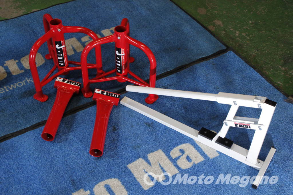 スクーターやビジネスバイクの修理やメンテでは活躍する機会も多いJ-TRIPの製品。単管パイプと組み合わせて使用するスタンド(左)、手動式ビードブレイカーなど、スタンド以外のJ-TRIPの製品はやはりプロメカニックに愛用者が多い。