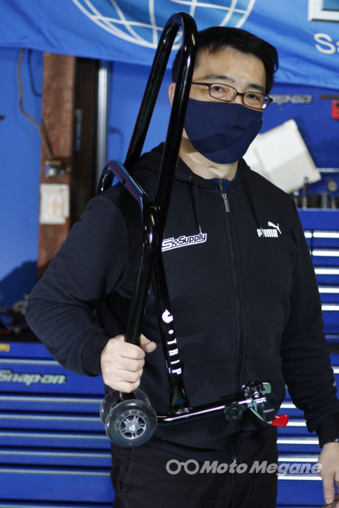 100分の1秒を争うレースの現場でも愛用者が多いJ-TRIPのメンテナンススタンド。多くのプロメカニックから支持されるその理由をSサプライのベテランメカニック畑中さんに伺った。