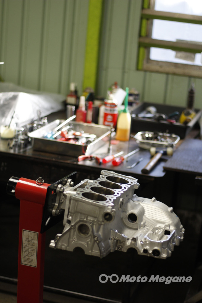 「Sサプライ」では、現在、レース参戦やサーキット走行を行うライダーのサポートだけでなく、街乗り車両や足代わりのスクーターまで幅広いメンテ、修理、カスタマイズ、持ち込みタイヤ交換などに対応している。プロのレースメカニックに作業を依頼できるのは大きな安心だ。撮影時はレースマシンのエンジン組み立てが進められていた。
