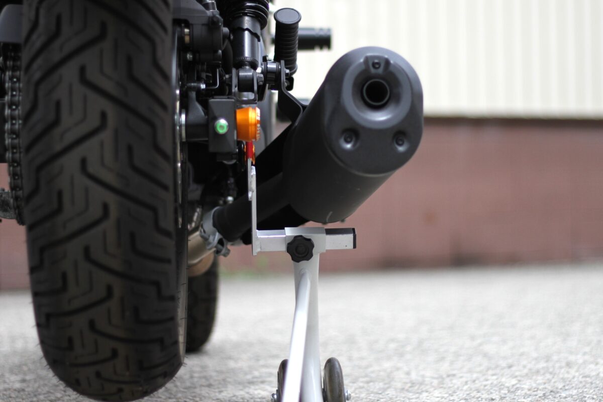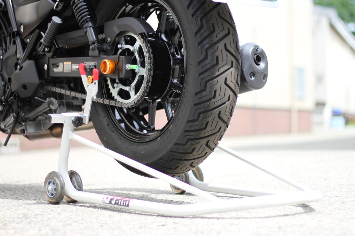 タイヤのリフトアップ量は約7cm。スタンドをかけた状態で後輪を取り外せるベストな高さを追求している。