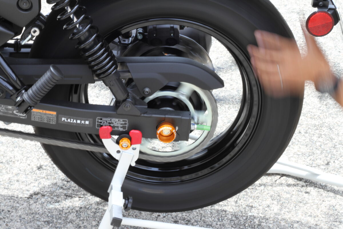それに、チェーンは均等に伸びず、たるみが大きい/小さい箇所があります。ホイールを回してたるみが小さい箇所を見つけて、そこで張り具合を調整するやり方が基本です。サイドスタンドではなかなか大変な作業ですよね。