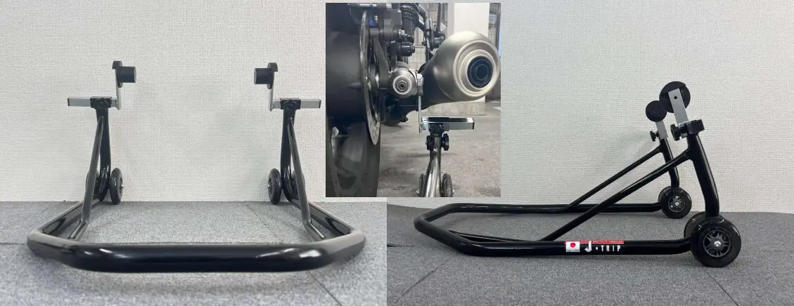 J-TRIP代表の森 賢哉(もり けんや)氏によると、整備初心者でも洗車やチェーンメンテ、タイヤ交換などを快適にできるよう開発したとのこと。