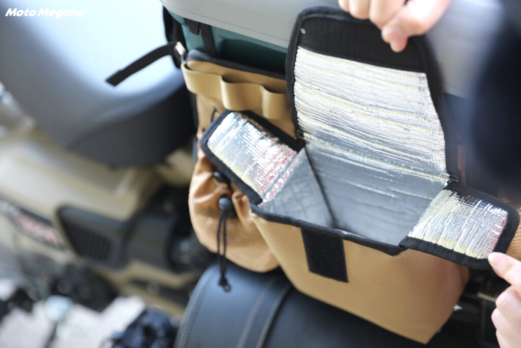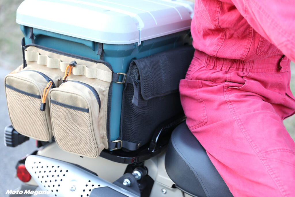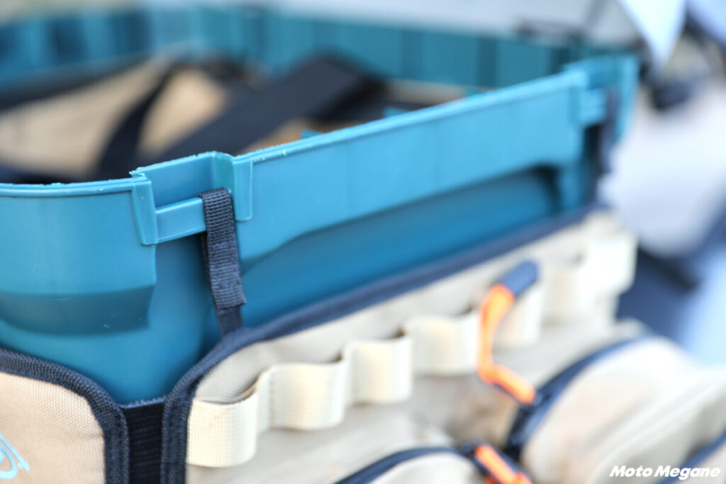 Jams Gold JGC-980 BOXOUTの特徴は、様々な小物の収納に特化していること。後部のメッシュポケットには濡れたレインコートをさっと収納することができる。ぴっちょりーな☆は、北海道ツーリングでメロンを買って収納して走る?とのことです(笑) 他にも保冷ポケットがあったり、前方は背もたれになるクッションが付いていたりと、ただのオシャレアイテムではないことが一目でわかる。これは便利だ。