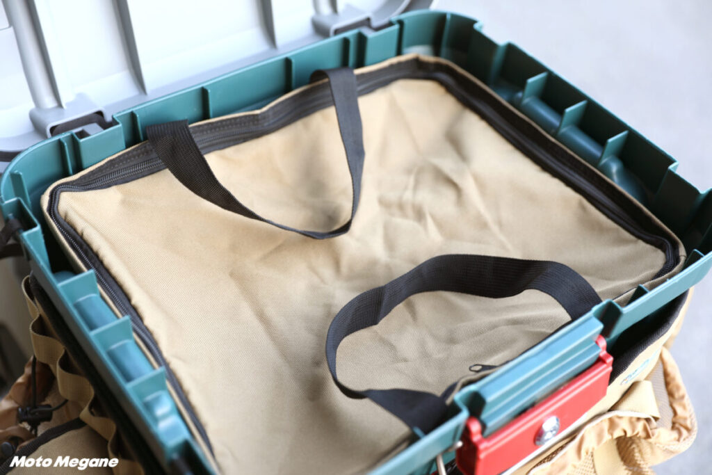 Jams Gold JGC-981 BOXINは内部が二重構造になっていて、下段に洋服や下着などを入れたうえで、上段にキャンプ用品などを収納できる。もちろん、どのように使い分けるかはオーナー次第。大きくて便利がゆえに、逆に整理整頓しにくいRV460の問題を一発で解消してくれる優れものだ。