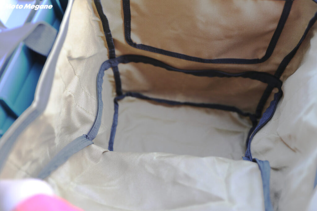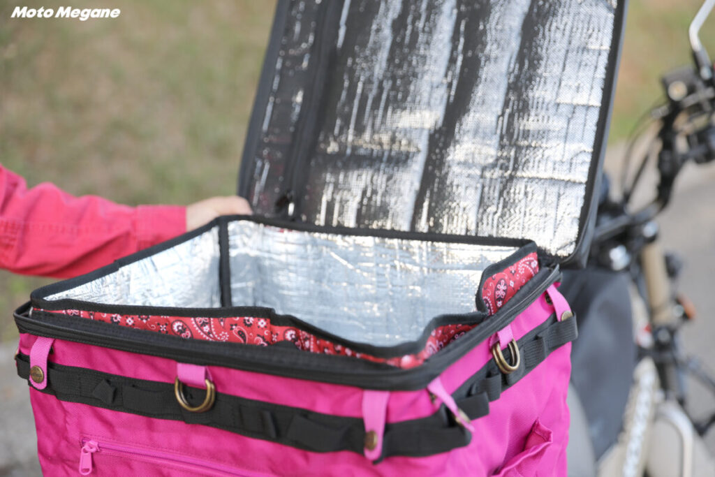 オシャレだけじゃなく利便性も考えてくれるJams Goldらしい特徴が、このインナーバック。かわいいペイズリー柄の保冷バックがインナーとして付属してくる。これは女子ライダーにも喜ばれそう。インナーだけを取り出して、ツーリング途中にお買い物だってできちゃうぞ。