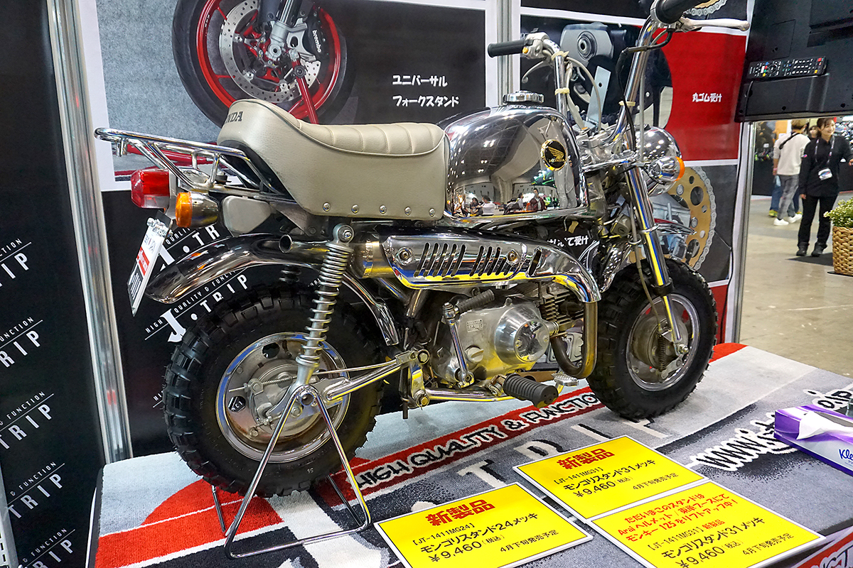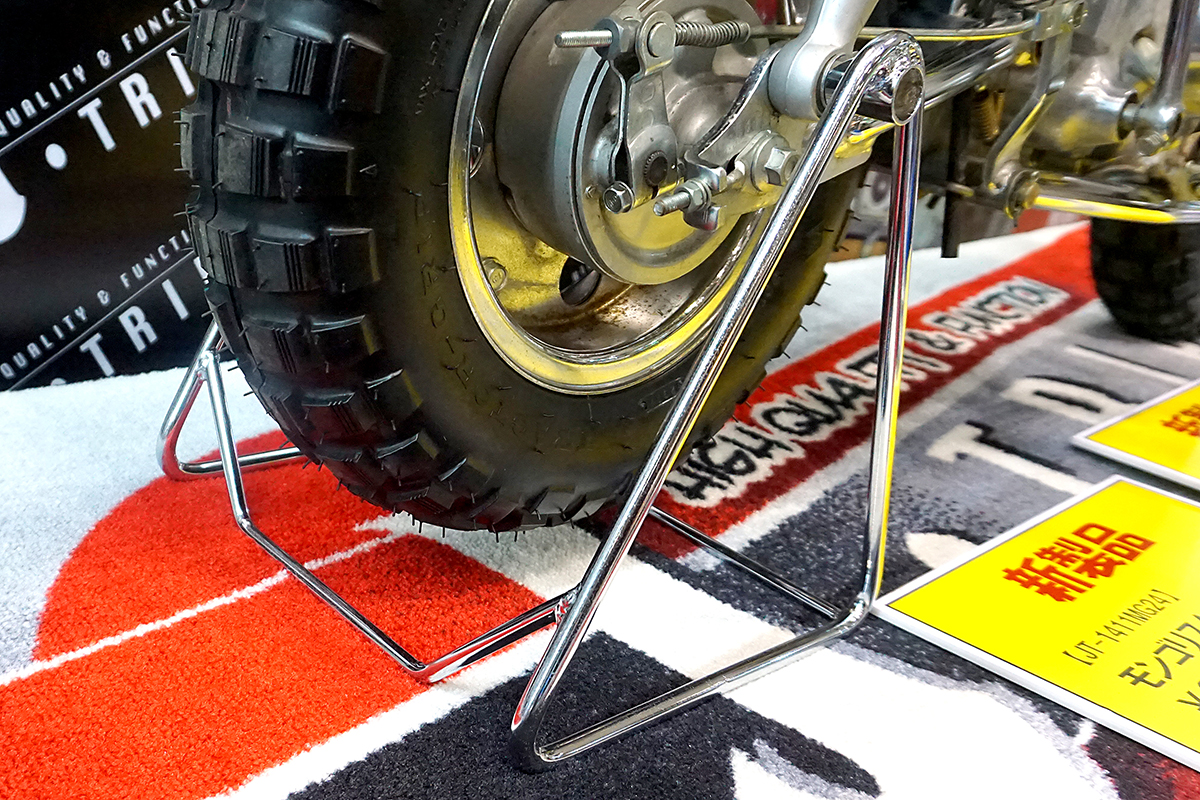 その名の通り、モンキーやゴリラをリフトアップするシンプルなスタンド。車体から必要以上にはみ出さないコンパクトな形状で、表面は美しいメッキ仕上げ。車両を喫茶店の店頭などにディスプレイする時にも最適なスタンドだ。