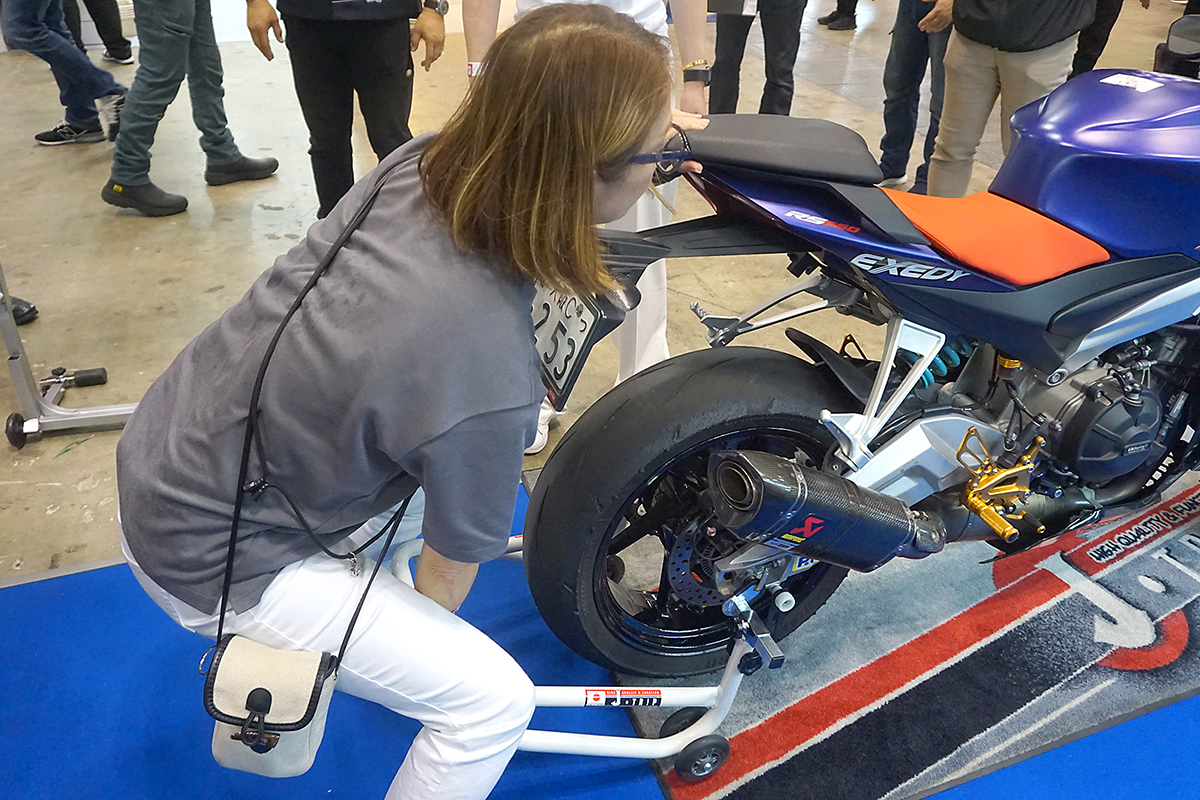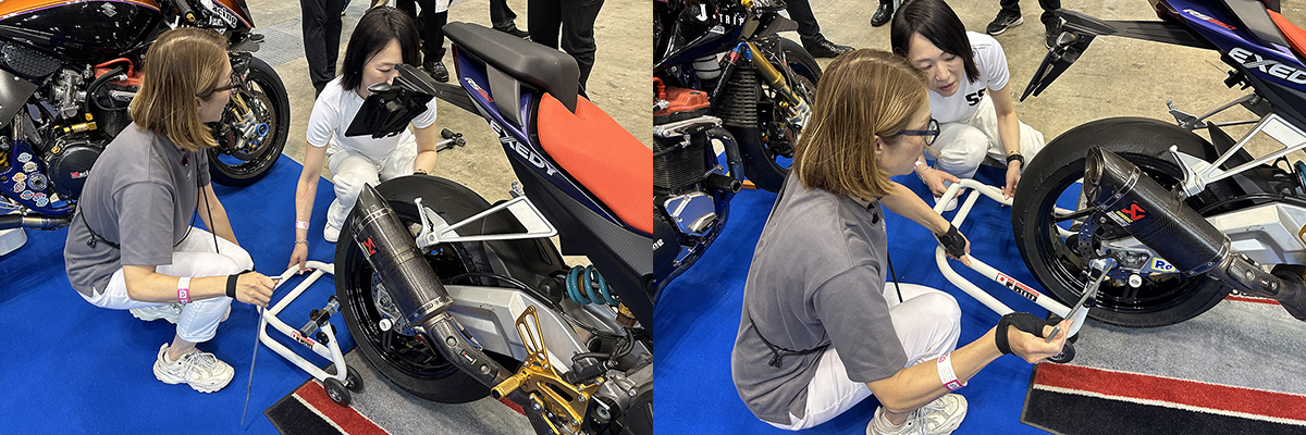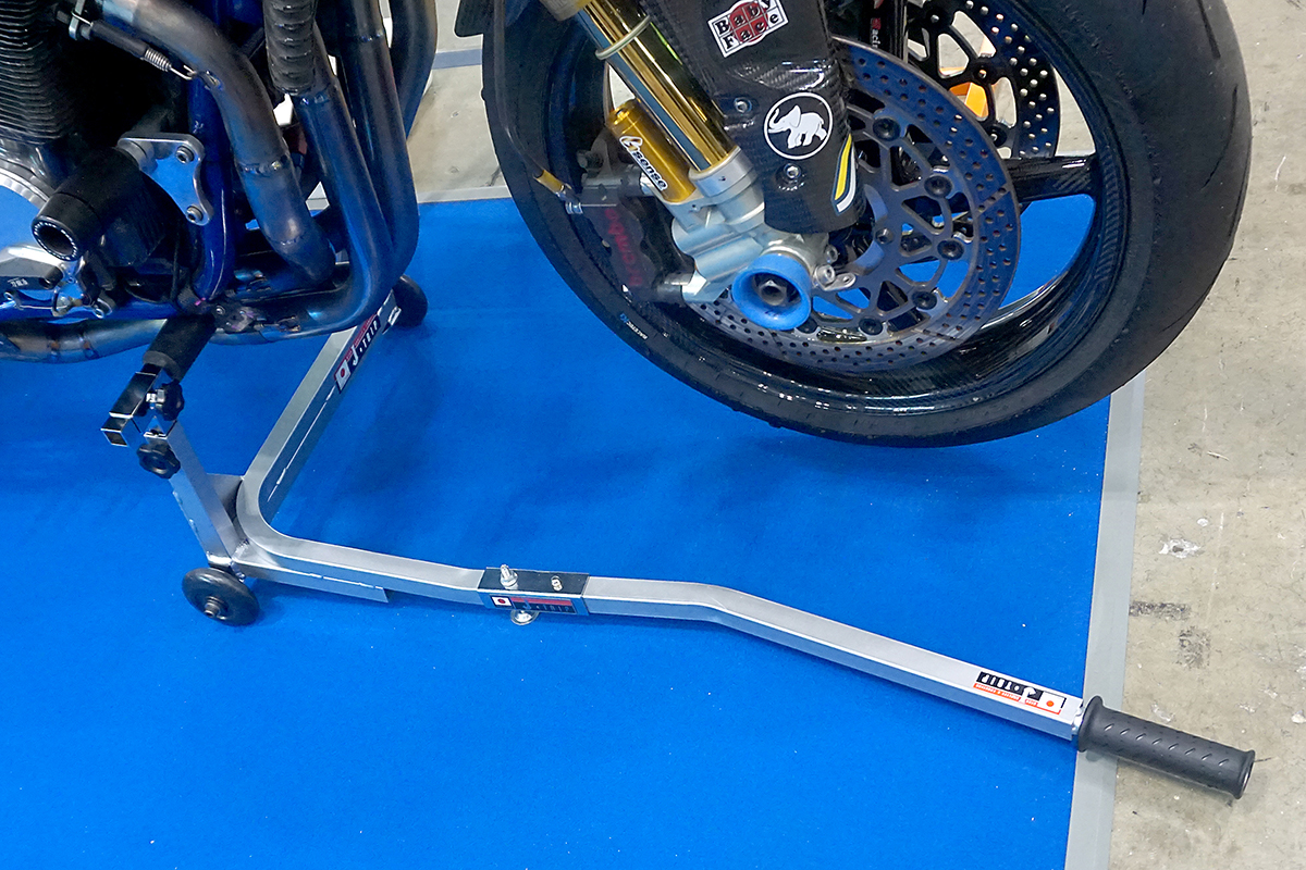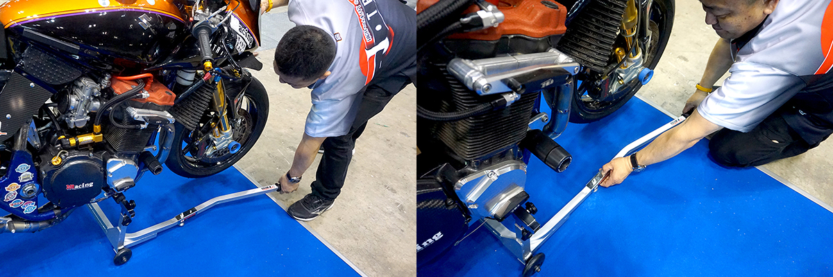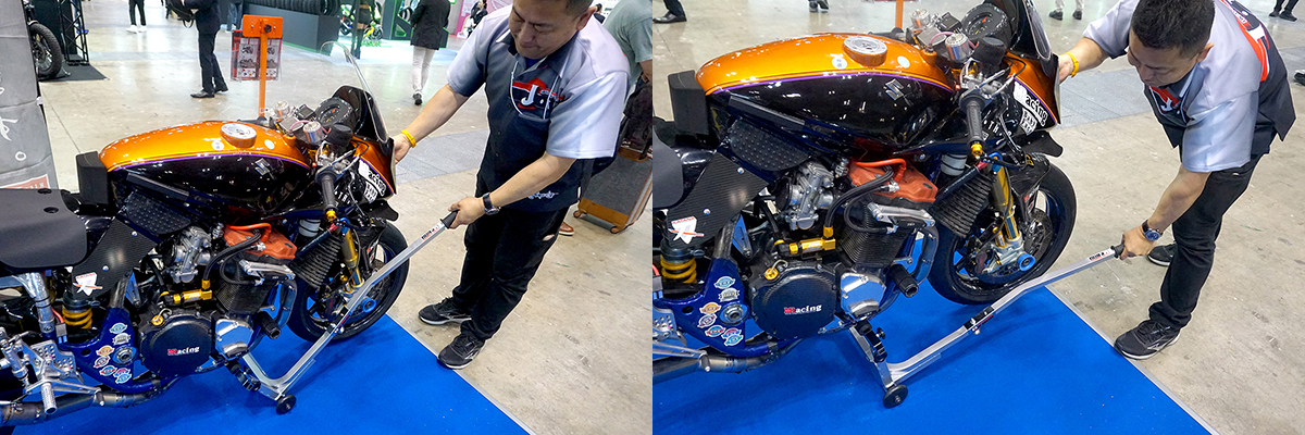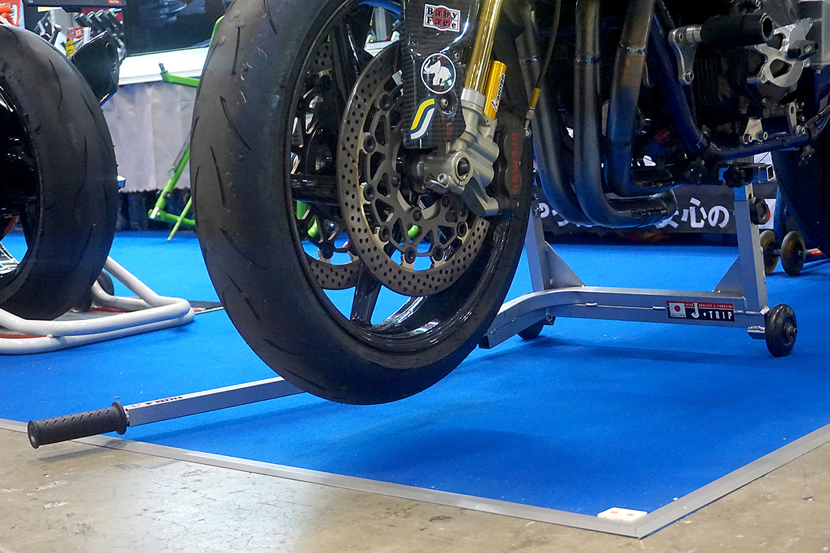 フレームスタンドは、エンジンの下にフレームが通っているバイクであれば、カンタンにリフトアップすることができる新製品。カウルの形状が特種で通常のフロントスタンドがかけられないバイクや、ステムまわりをバラして整備したい時などに便利だ。材料の手配もすんでいるのでまもなく発売になるという。