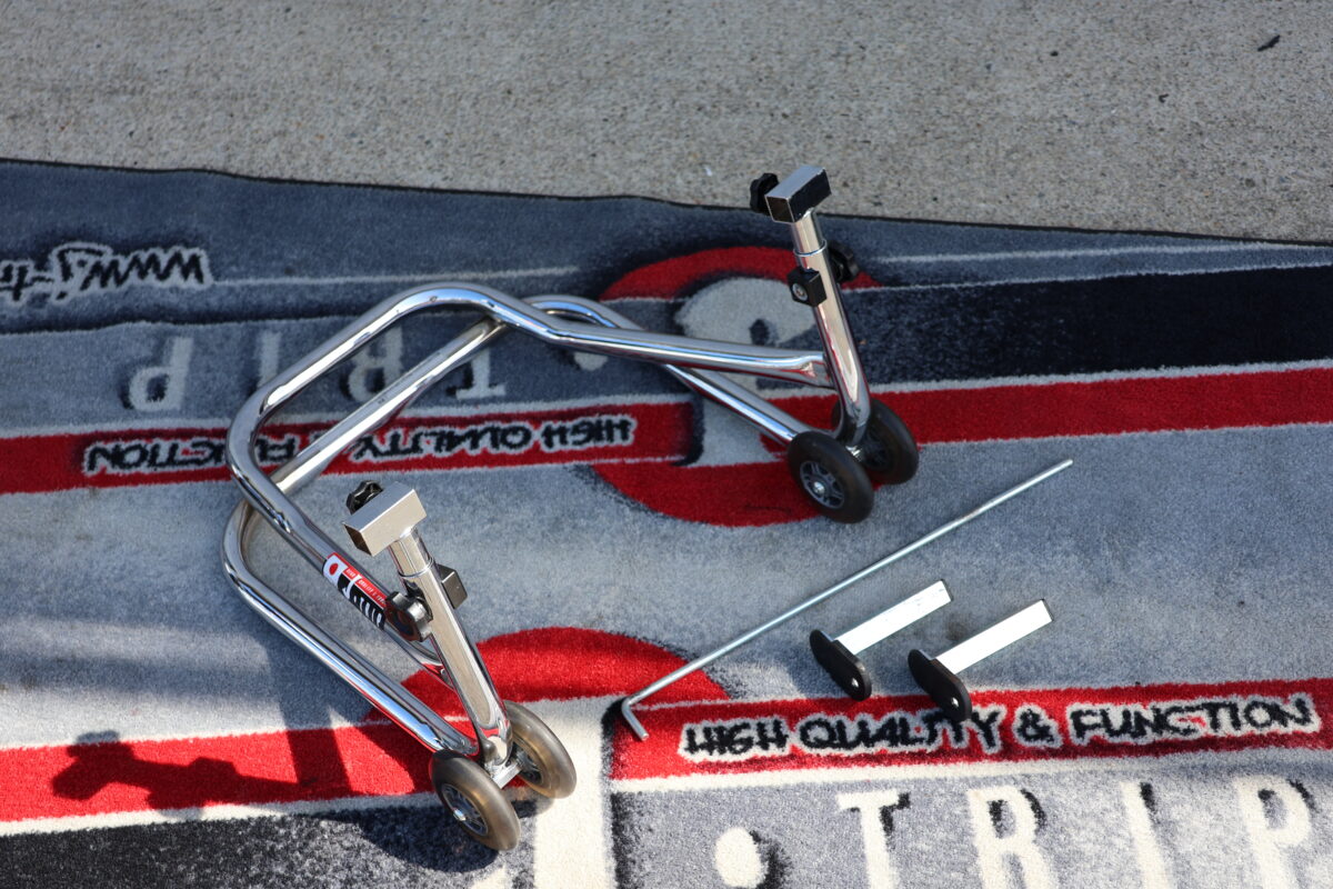 あえて「はじめてスタンド」の “欠点” を上げるとすれば「リアホイールの脱着ができない」ことだが、ホイール脱着など行いたい向きには、J-TRIPでV字やL字の受けもオプションで設定されているので、それを使用すれば作業は可能だ。