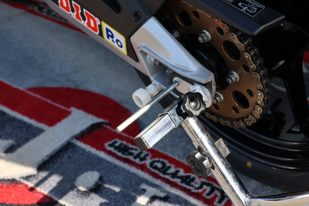 これで気になるリヤホイールまわりの汚れ落としはもちろん、ドライブチェーンの清掃・調整がスピーディに行えるし、長期保管にも有効だ。