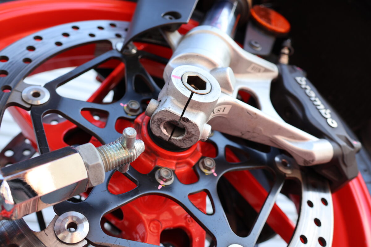 ②フロントフォークの底部に穴が空いているのだが、ここにフォークスタンドの先端を差し込む。左右のフロントフォークの底に8mm以上の穴が空いている最大18インチ車までならほとんどの車種に使用が可能だ。また、幅・高さともに無段階で調整可能なのでフロントフォークの左右高さが違う車両にもぴったりフィットする。