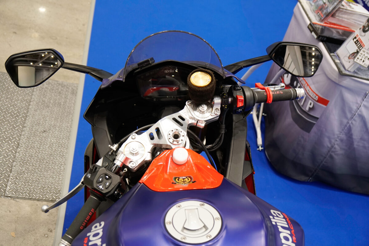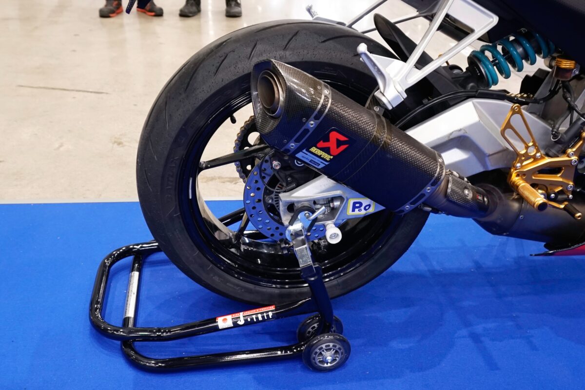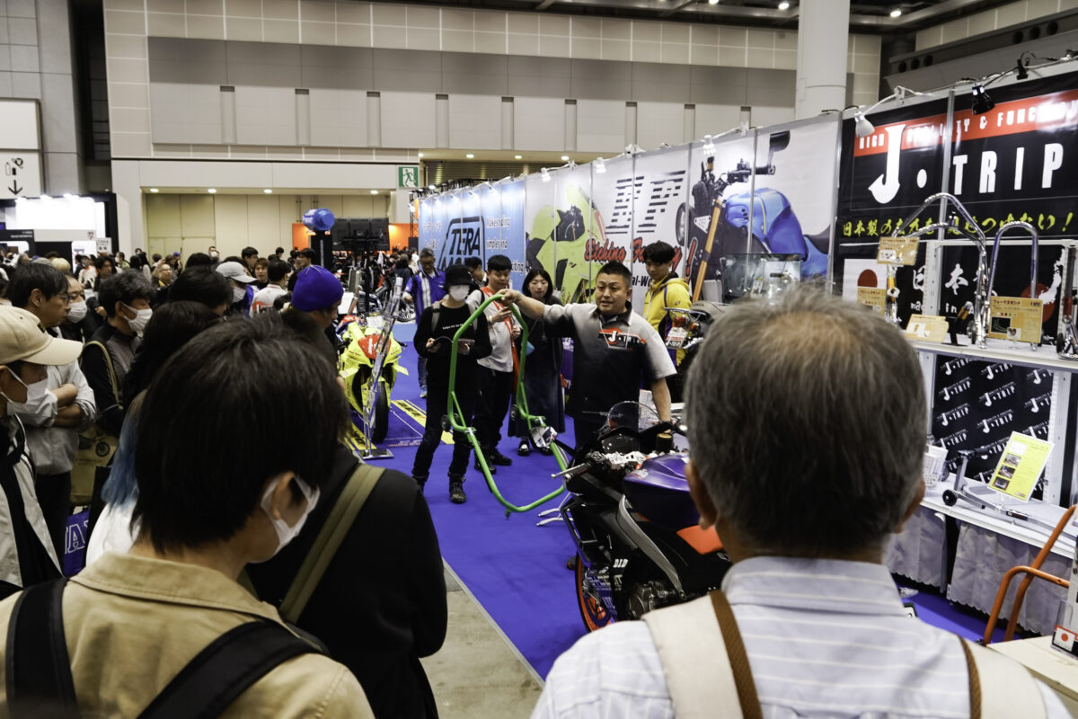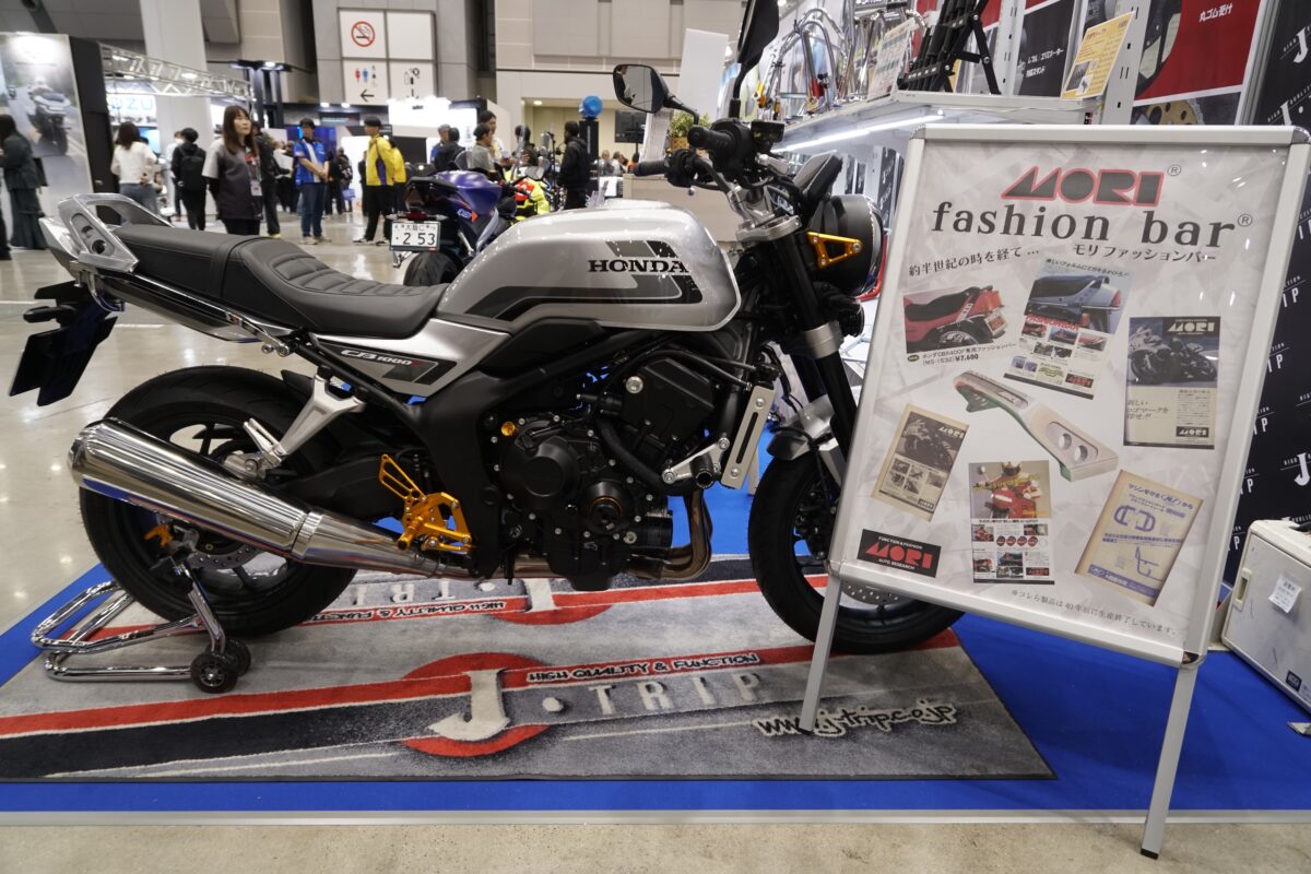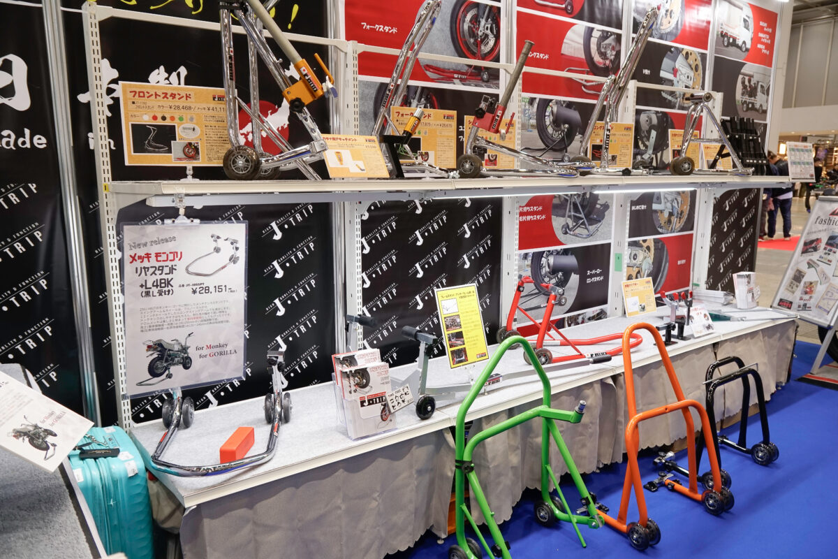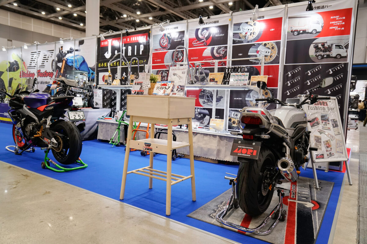 社長自らのメンテナンススタンド実演紹介も人気となっているJ-TRIPブース。さまざまなタイプのメンテナンススタンドに加えて、今年は新製品の「モリファッションバー」がCB1000Fに装着されて展示された。数ある製品の中から注目のアイテムを紹介していこう。