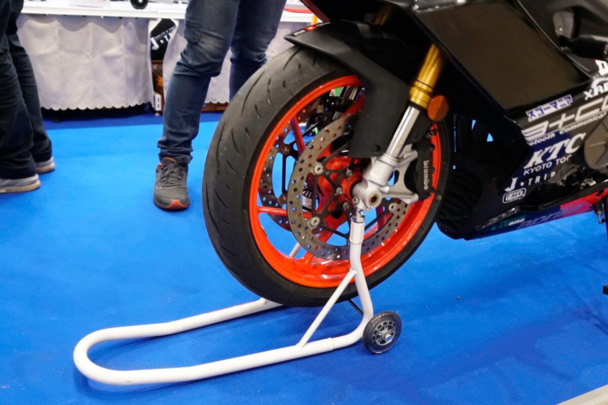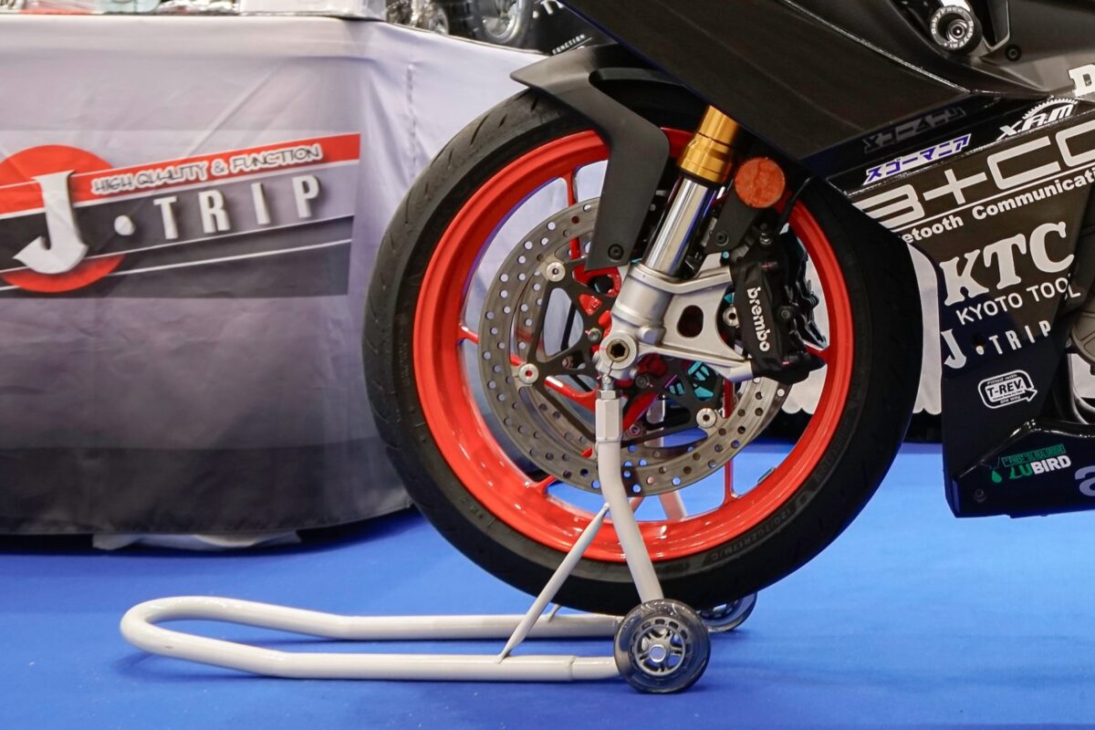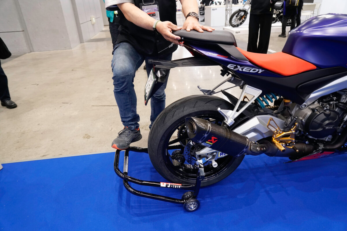 後輪をスタンドアップする「ロングスタンド」、前輪をスタンドアップする「フロントスタンド」といったメンテナンススタンドをメインに、ホイール脱着時に抜いたアクスルシャフトを一時的にキープできる「アクスルシャフトホルダー」、楽にビード落としができタイヤ交換の作業効率を高める「ビードブレーカー」など、J-TRIPは足まわりのメンテナンスに関わるアイテムを幅広く手がけている。また、初めてでも一人で簡単にスタンドアップできる「はじめてスタンド」もラインナップし、ビギナーも安心・安全に使用できるのもJ-TRIP製品の特徴となっている。さらにJ-TRIP森社長自ら製品の実演紹介もあり、多くのギャラリーを集め、J-TRIPブースは大盛況だった。