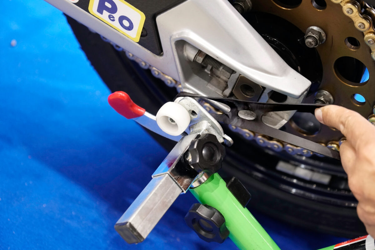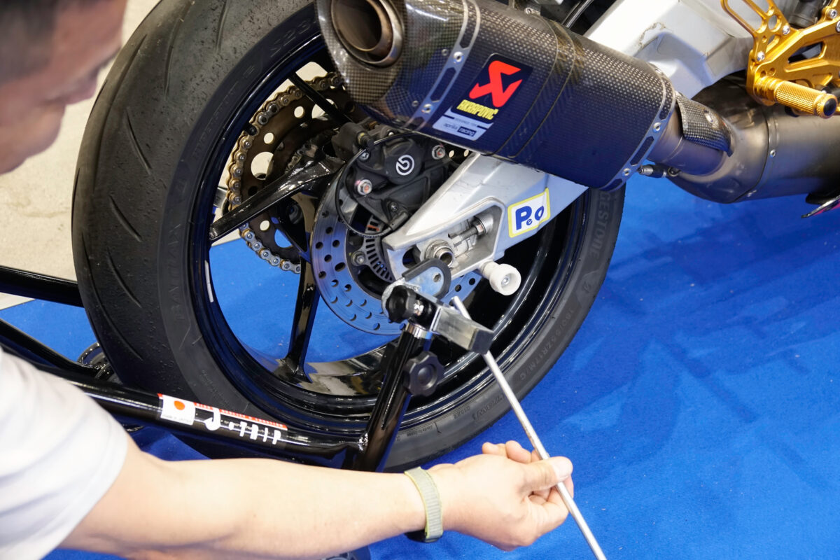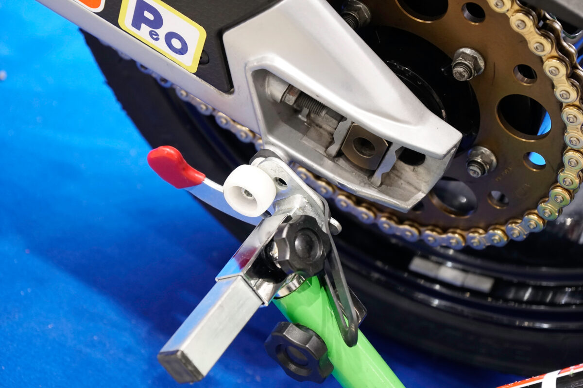リヤホイールの着脱を行ないたい場合や、非貫通のアクスルシャフト装着車両をスタンドアップする際は、スイングアームに「フックボルト(価格:3025~3575円)」を装着し、そのフックボルトをV字型の「V受け(価格:4312~6193円)」で支える。